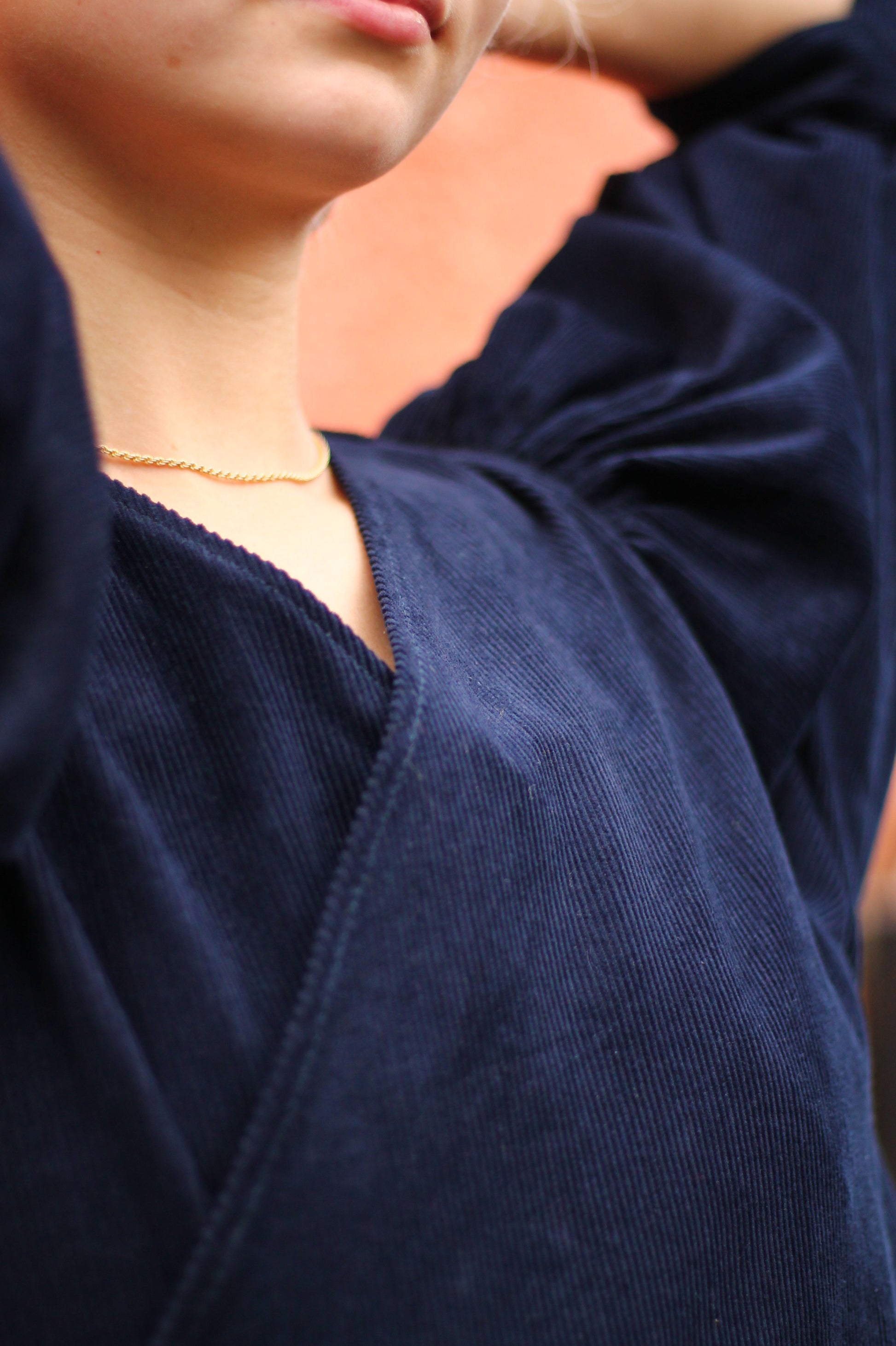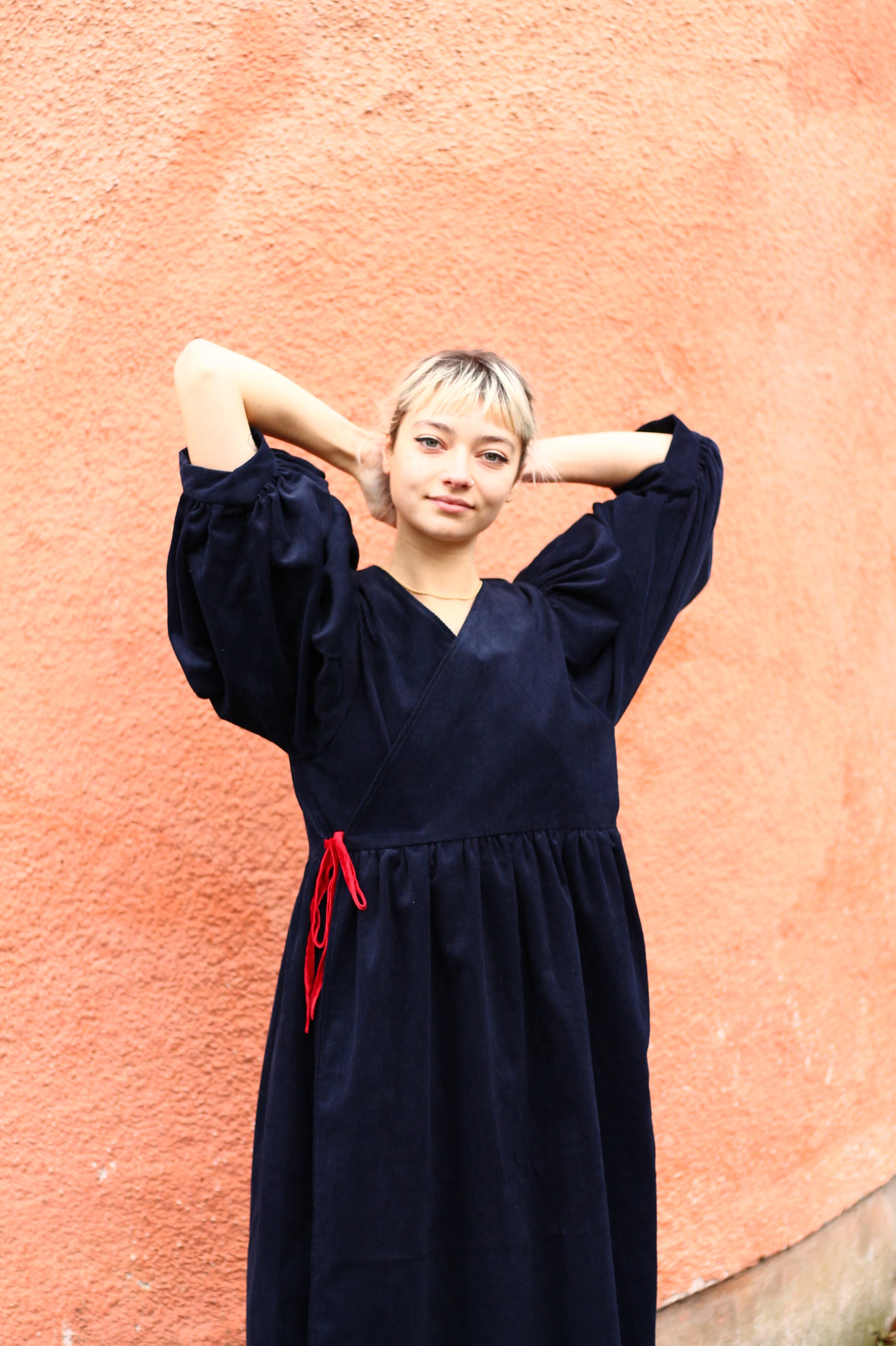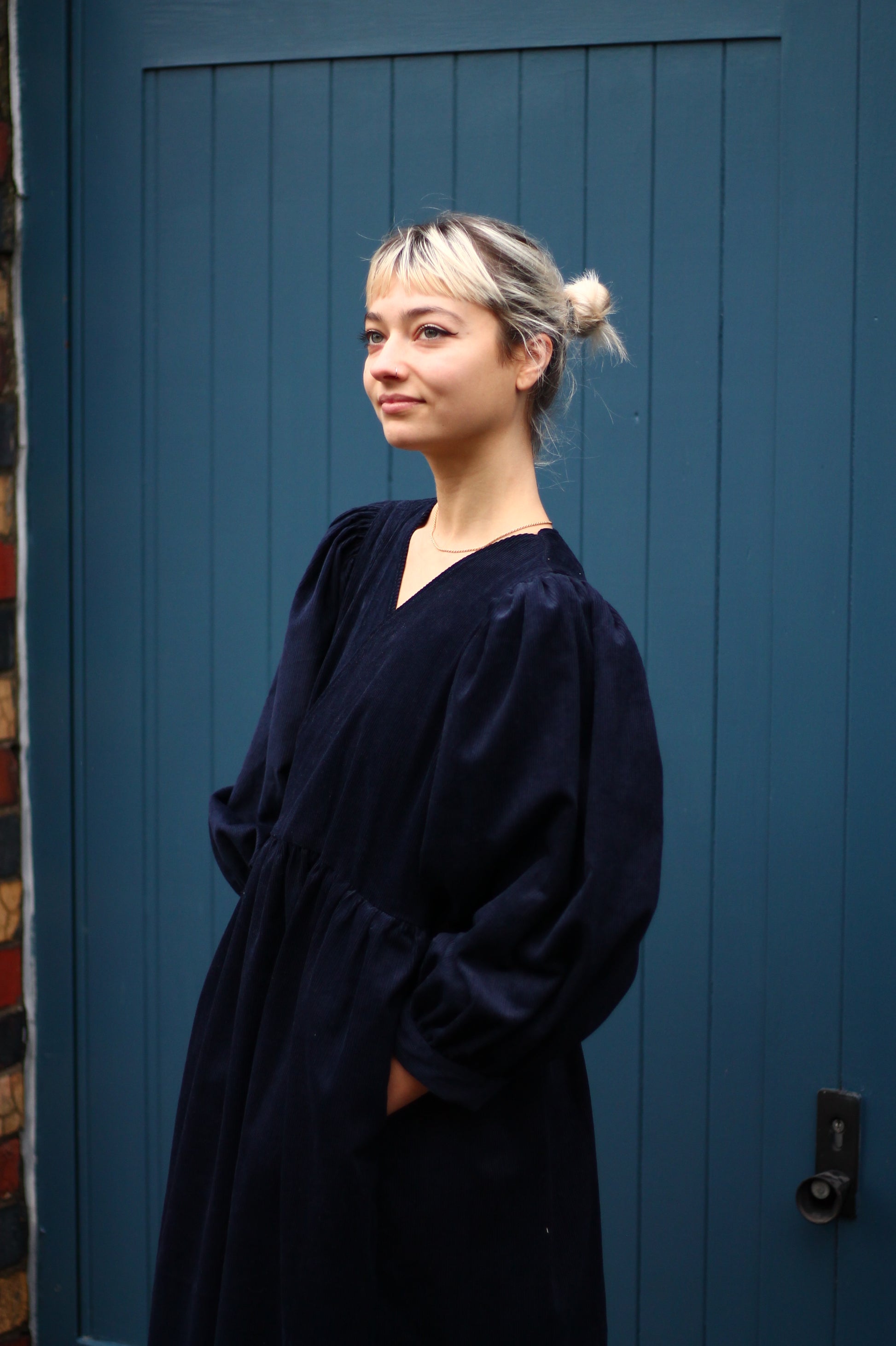 Made from a deep navy midweight cotton corduroy this beautiful fabric adds depth and texture to any outfit. Being such a warm and dark colour this piece looks lovely layered over other pieces. Can be worn as a jacket during warmer months and a top layer during cooler months this is the perfect piece to carry you throughout the year. Our Midnight cord colourway closes with a contrasting ruby red double velvet ribbon.
