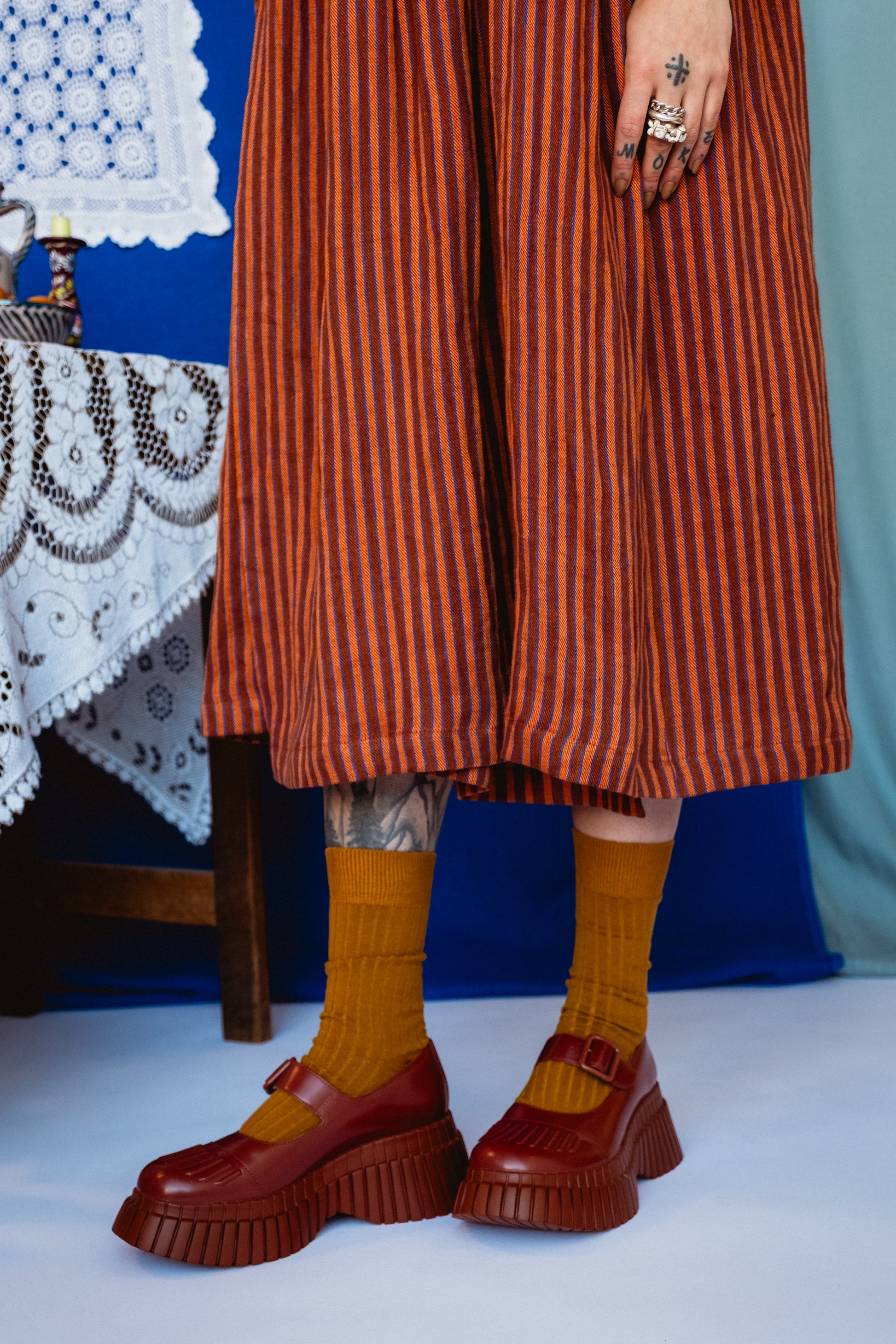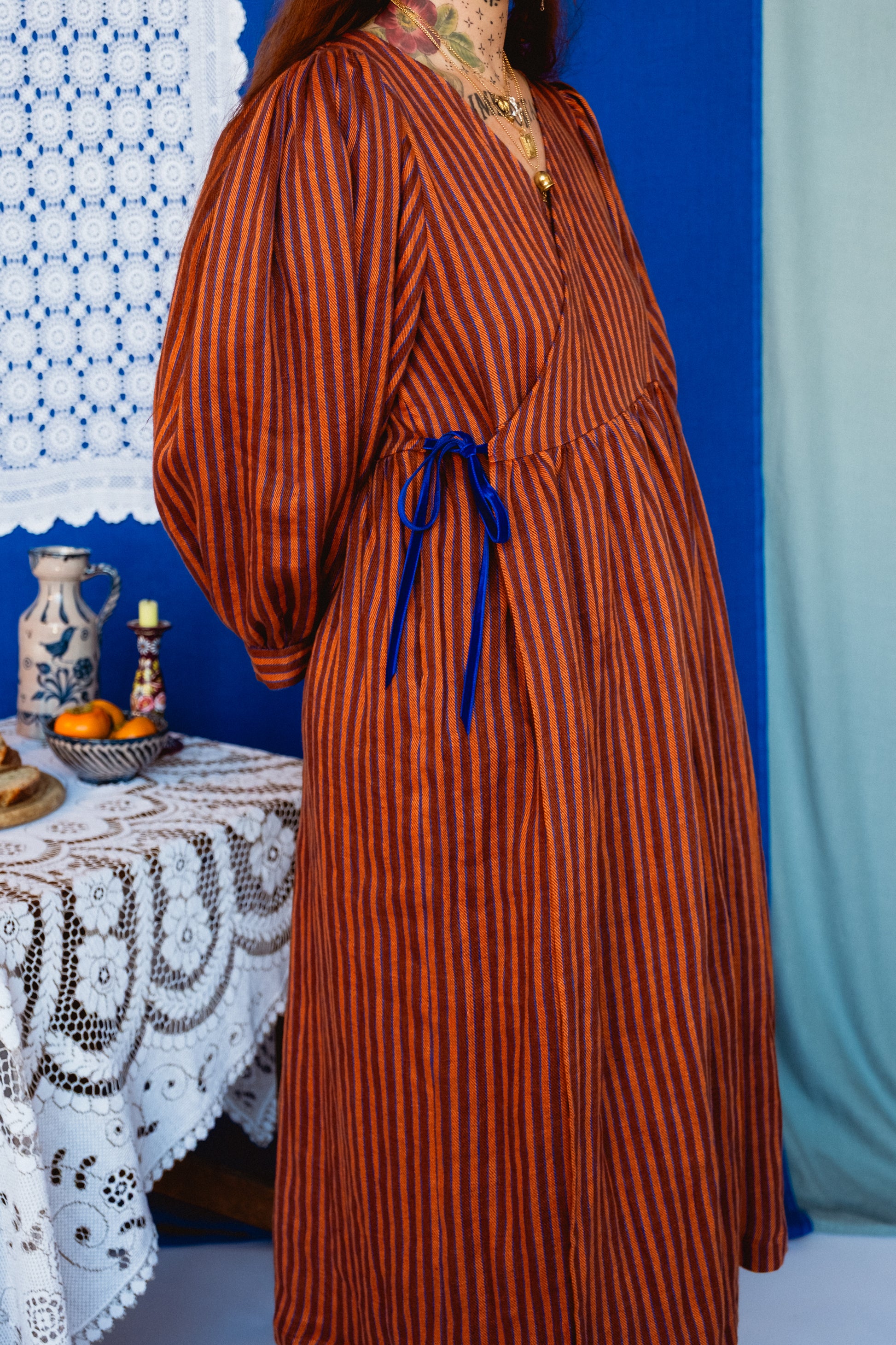 A heavier weight to our other linen ranges, this striped twill is the perfect fabric to transition the seasons with you. Naturally breathable and bouncy, this fabric is made from 100% Eastern European linen in small batches. In a bold cinnamon and pumpkin stripe and outlined with a vibrant cobalt, this unique colourway will be a striking addition to any outfit. To bring out the beautiful blue stripe we have paired our Toasted Cinnamon Stripe with a cobalt double sided velvet ribbon.