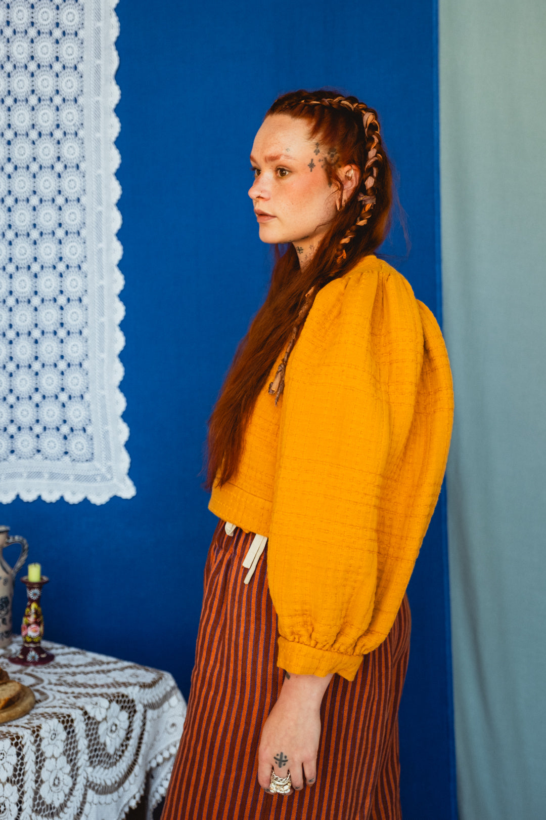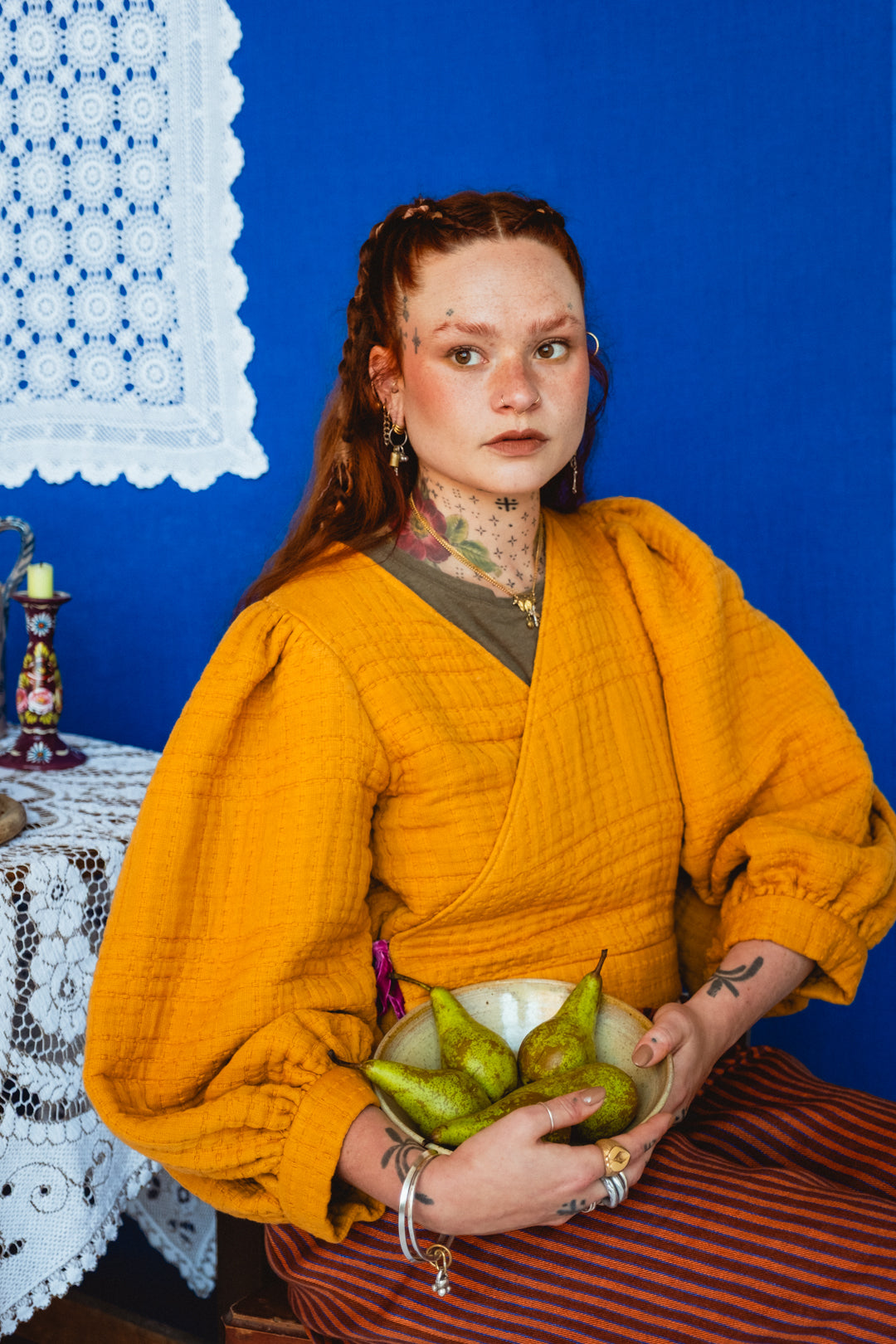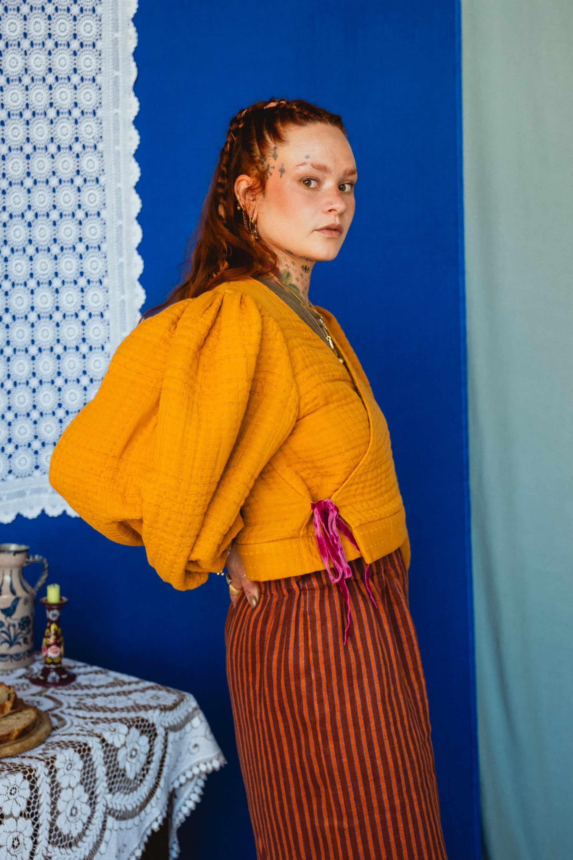 The Squishiest and cosiest cloud to ever adorn the sky, our Cloud 9 wrap jacket has balloon gathered sleeves that will make you feel like you could float. Our Cloud 9 jacket has been designed with a cropped-boxy body that wraps around and is tied with a double-sided velvet ribbon at the side. Its ginormous gathered sleeves are designed to fall ⅞ length and hemline falls at pelvis.