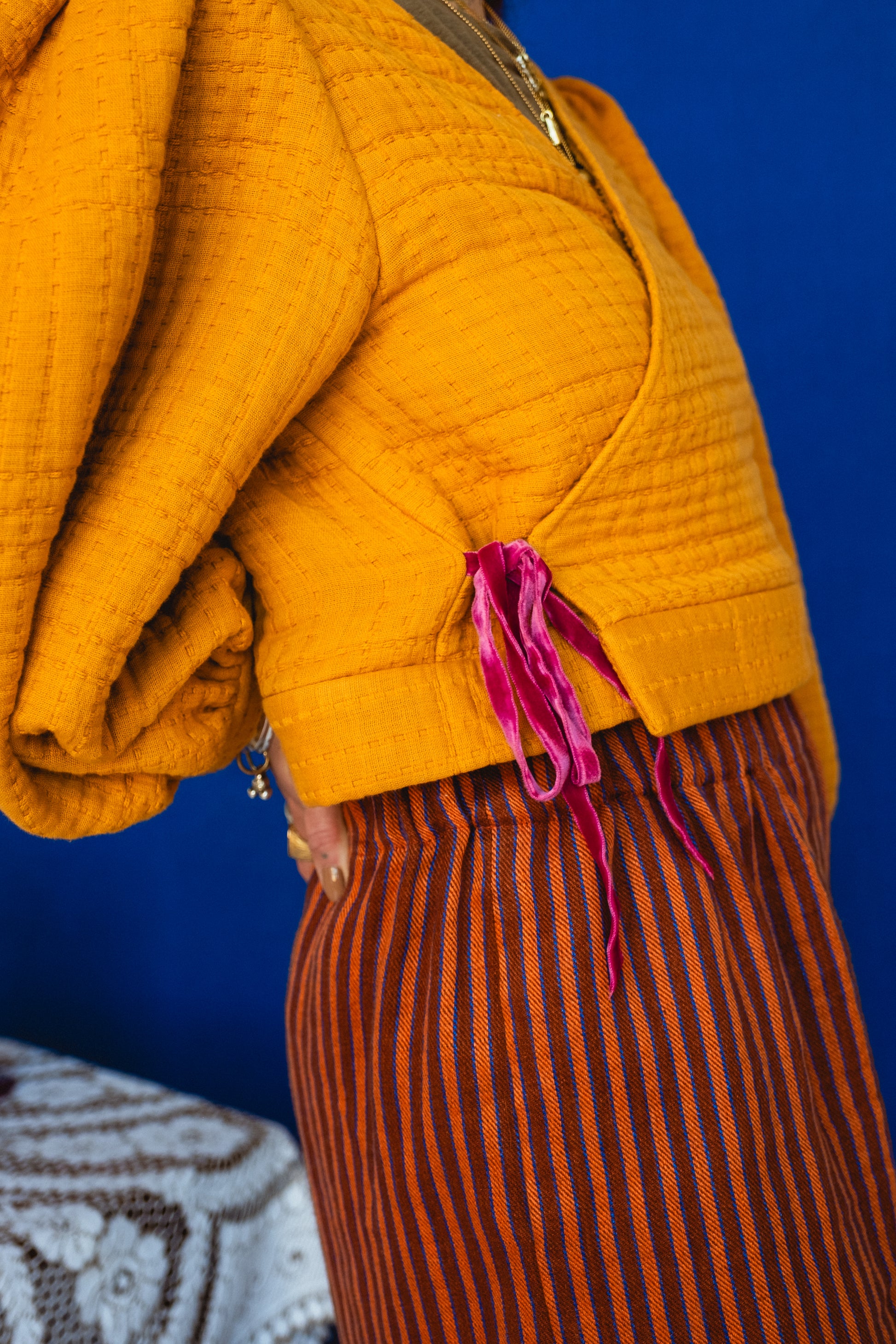 A bright honey mustard take on our classic Almond quilt. To join our squishy alumni, this vibrant quilt-like fabric is the perfect pop of colour to any outfit. Made from 100% Indian cotton this fabric is both cosy and breathable.  We have paired our Cloud 9 designs with a contrasting fuschia double-sided velvet ribbon, creating a unique colour story.