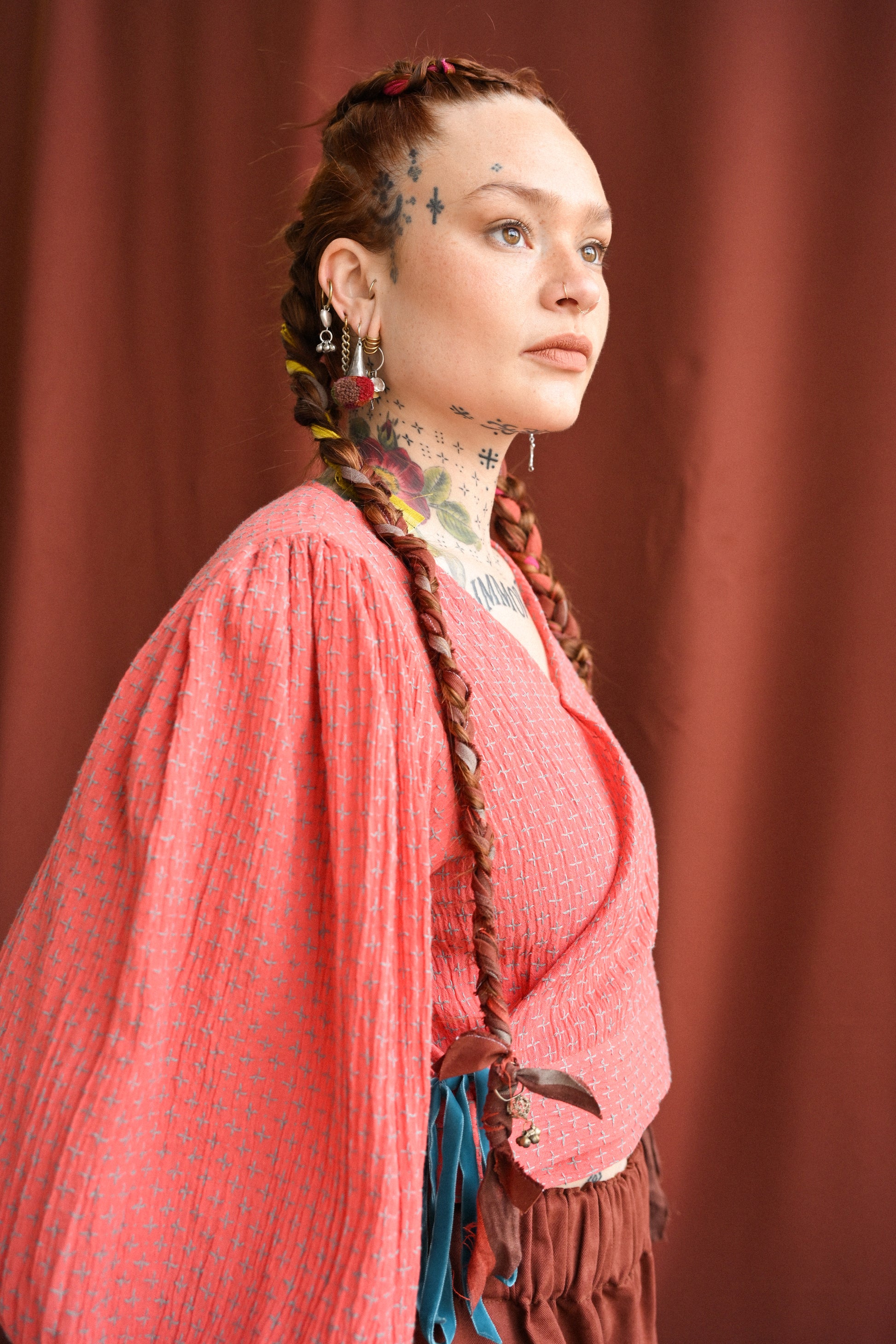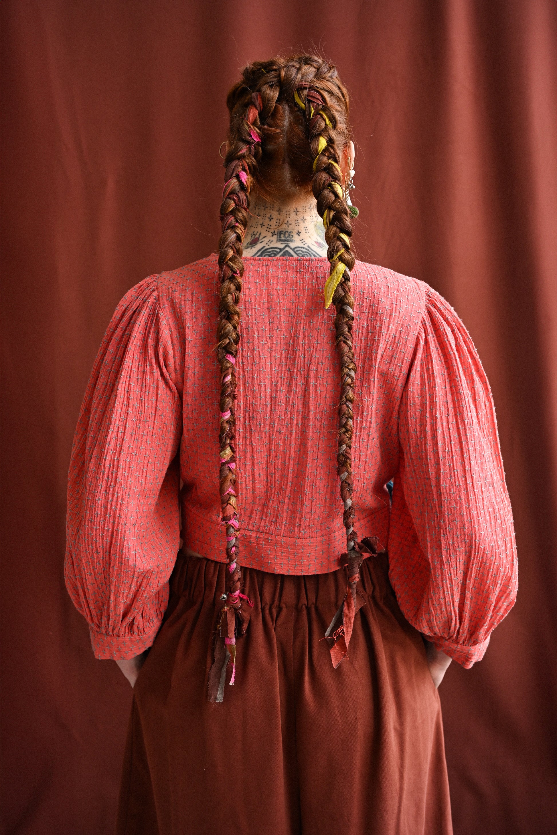 A beautiful Indian cotton with a unique cross design woven all the way through. We love this fabric for its unusual colour palette, with a gauzy coral-coloured cotton base and sky-grey cross design that has been jacquard woven in. This weaving technique gives the fabric a handmade quality and adds a lovely texture to your outfit. Due to this design aspect we only offer this fabric in our Cloud 9 Top and Dress. We have paired our clouds with a beautiful teal double-sided velvet ribbon, contrasting with the bright coral base.