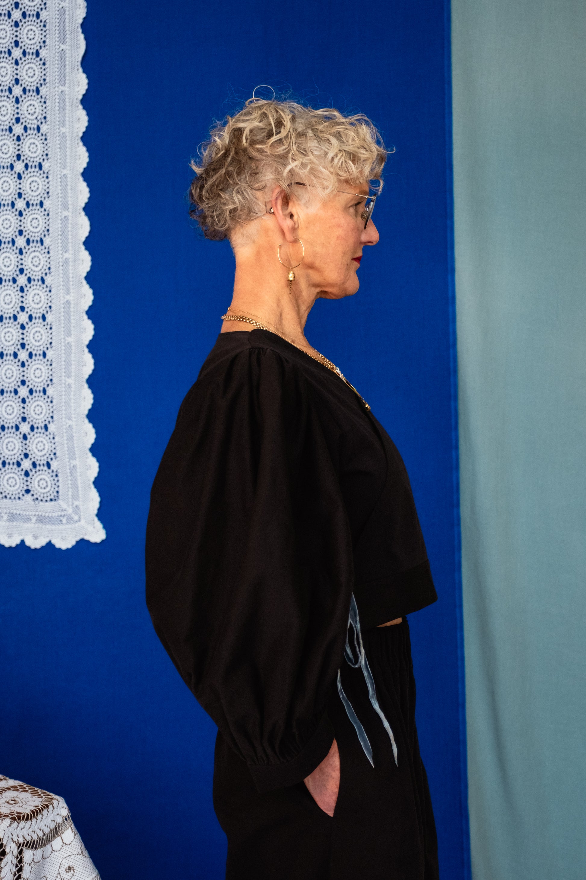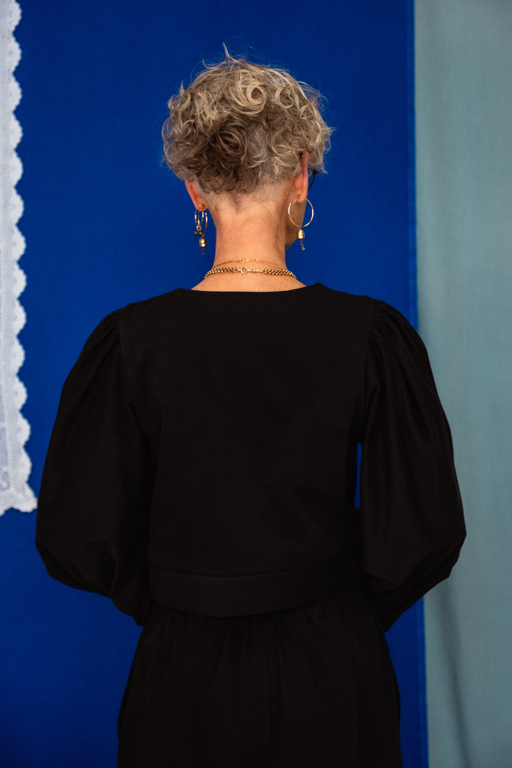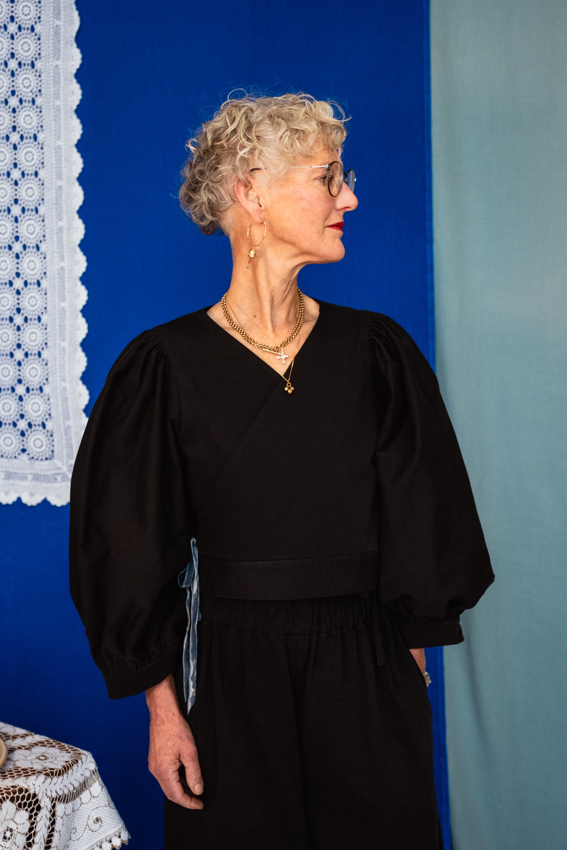 Made from 100% organic cotton, this beautiful mediumweight twill means our garments hold their unique and dynamic shapes - as intended! Inspired by workwear this fabric is set to last you for many years to come against all elements and all the seasons. In a classic rich black, this is the perfect piece to take you from the office to the town.  Our Cloud 9 range has been paired with our ‘Stormy’ double sided velvet ribbon. A beautifully complex colour with flashes of blue and silver - just like a stormy sky.