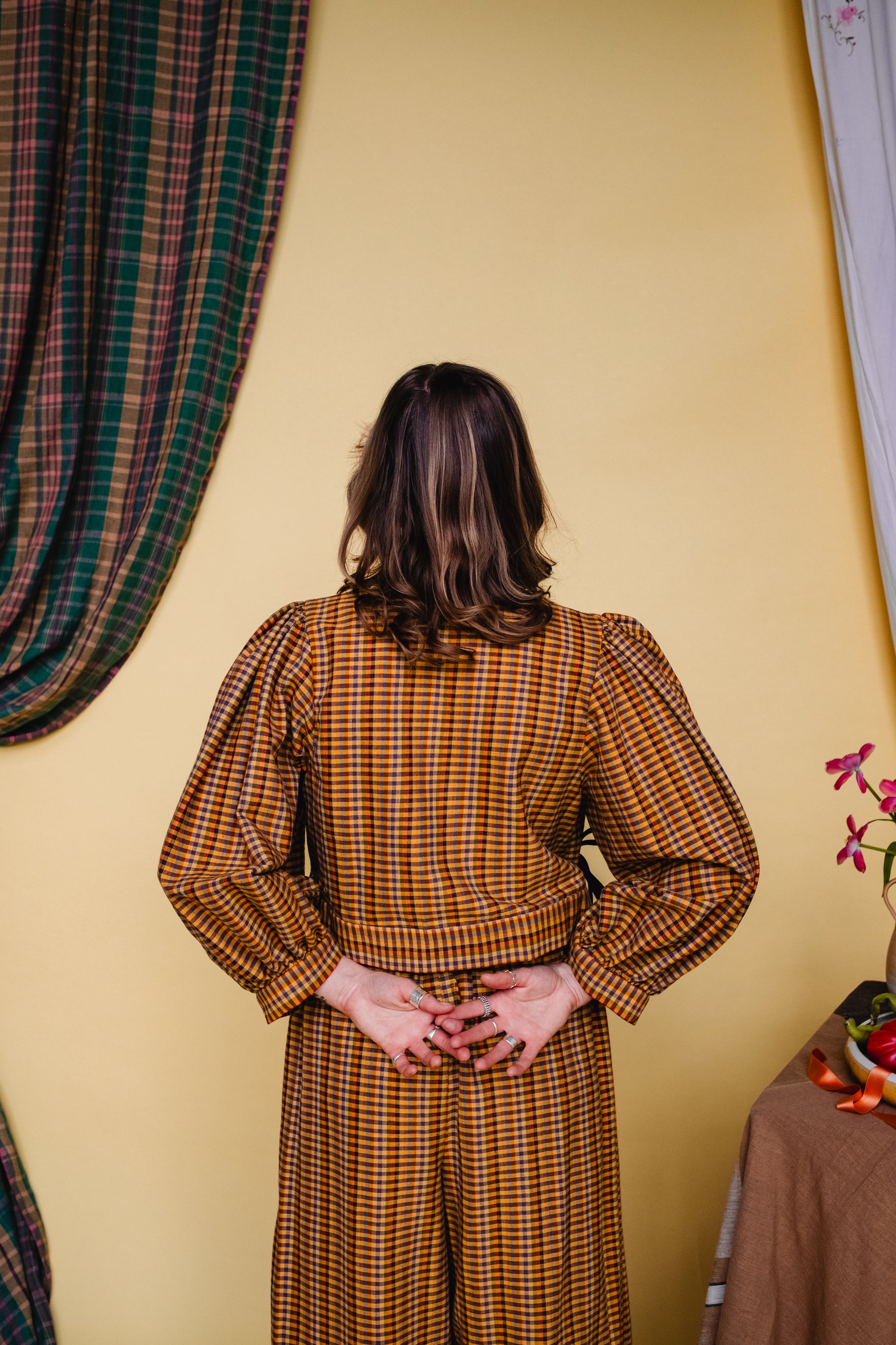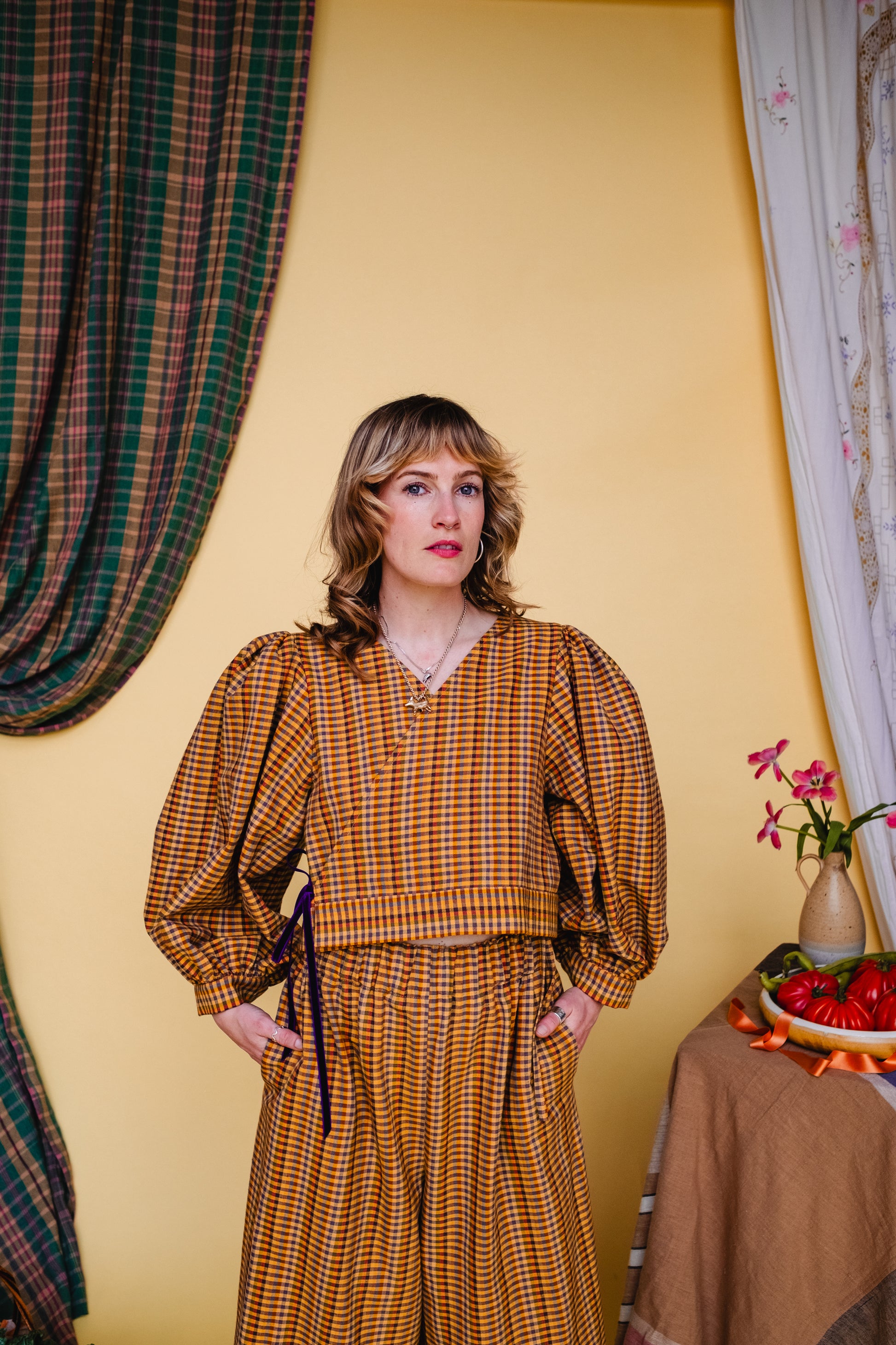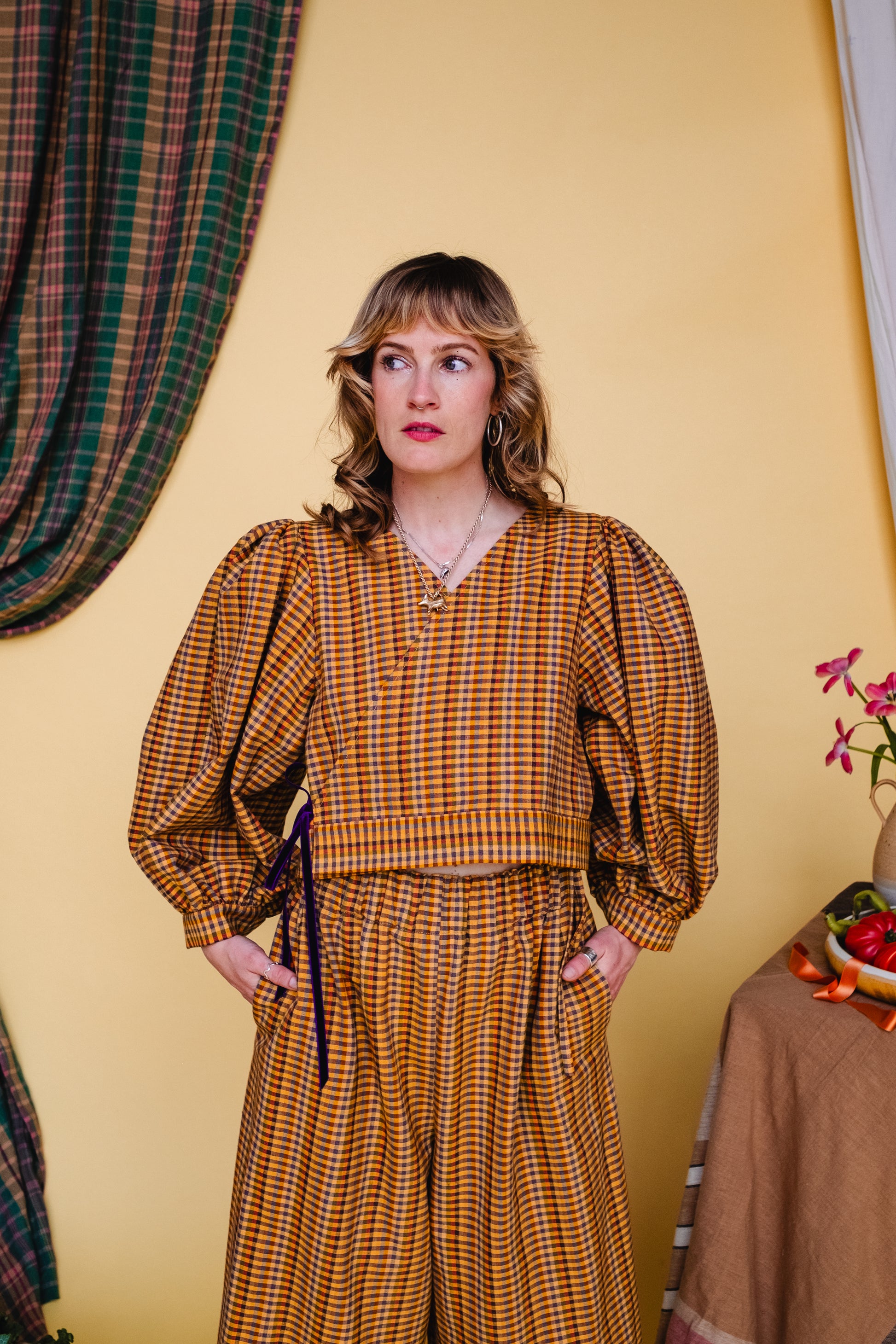 A midweight Indian cotton in an array of sunset tones, our Oslo check was aptly named after the vivid murals in Oslo town hall depicting pastoral life throughout the history of the city. With greens, blues, and reds all mixed among the orange tones, this multicoloured check will instantly be the breath of life you need in your everyday wardrobe. With a soft, almost brushed texture, this fabric will guarantee all day comfort whether you’re adventuring or slothing.   Our Oslo Check has been paired with a deep violet double-sided velvet ribbon, to bring out the deeper tones in the design.