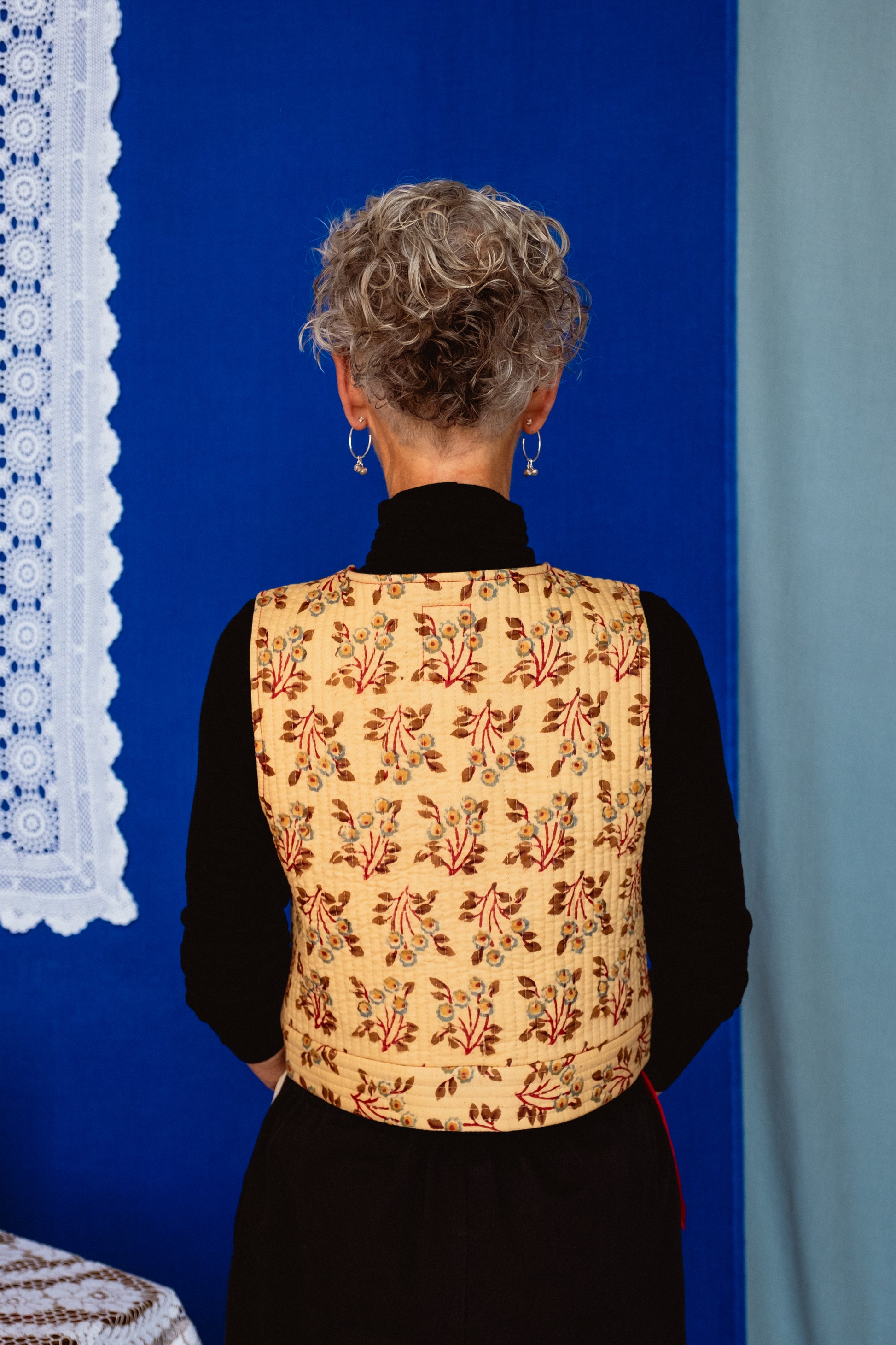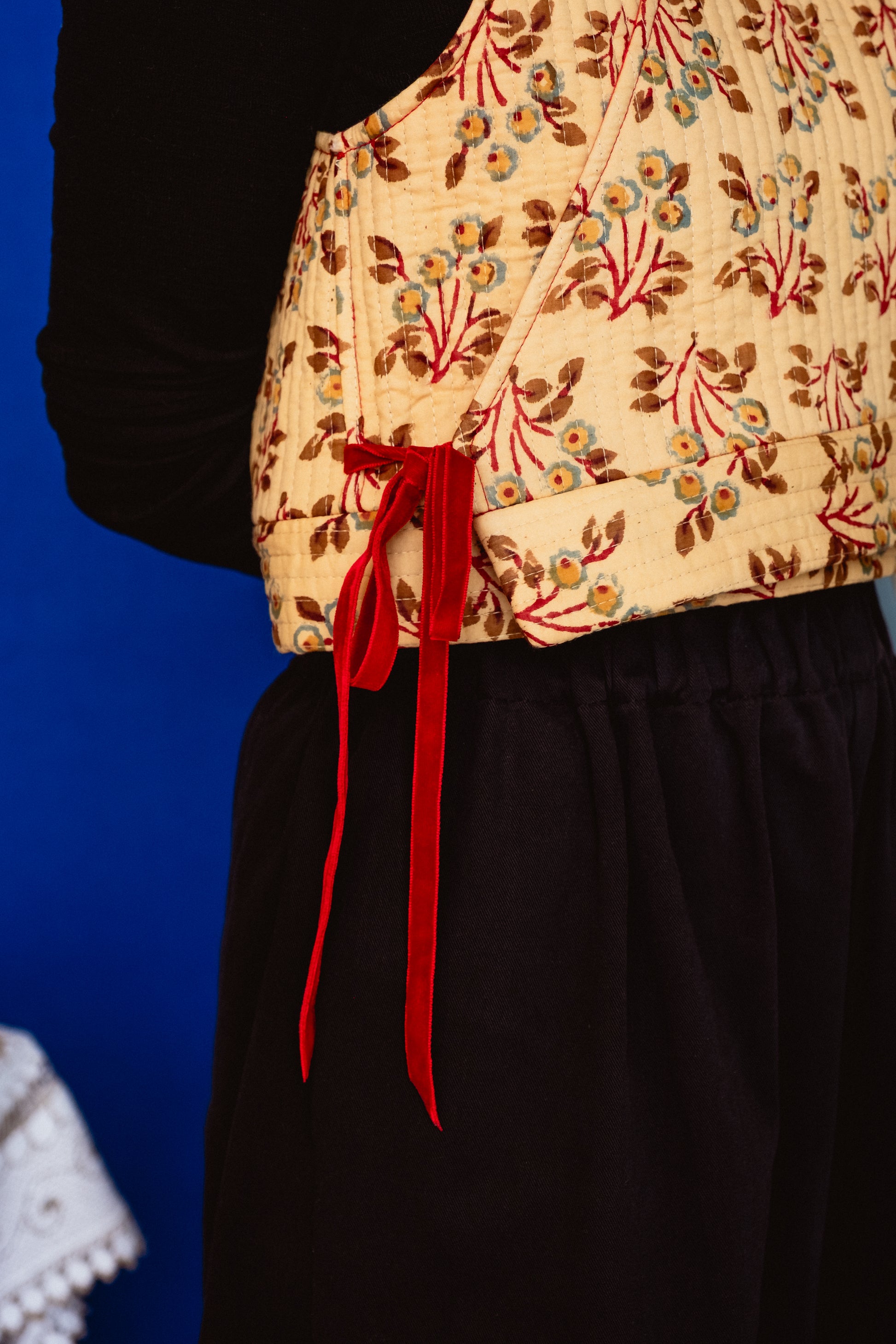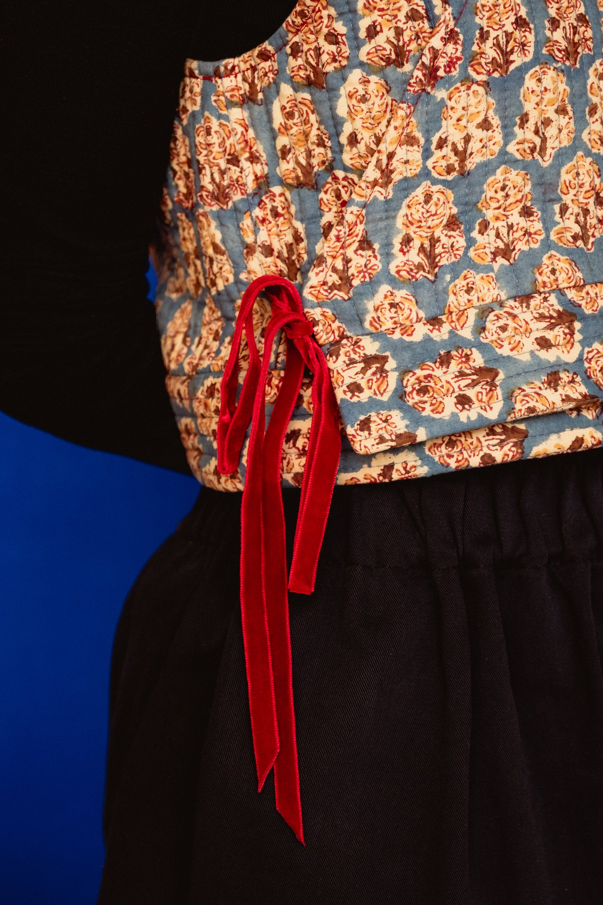 Named after the Bloomsbury group farmhouse, this printed cotton quilt evokes the eclectic interior visuals of Charleston. Quilted with a cotton wadding, this vest is the perfect layer to take you through all the seasons. Made with 100% Indian Block Print Cotton, this vest features two floral designs which we thought were equally so stunning we are offering both as an option! Sewn with contrasting red thread and binding, we have also paired our vest with a bright ruby-red double-sided velvet ribbon to make the whole vest pop.