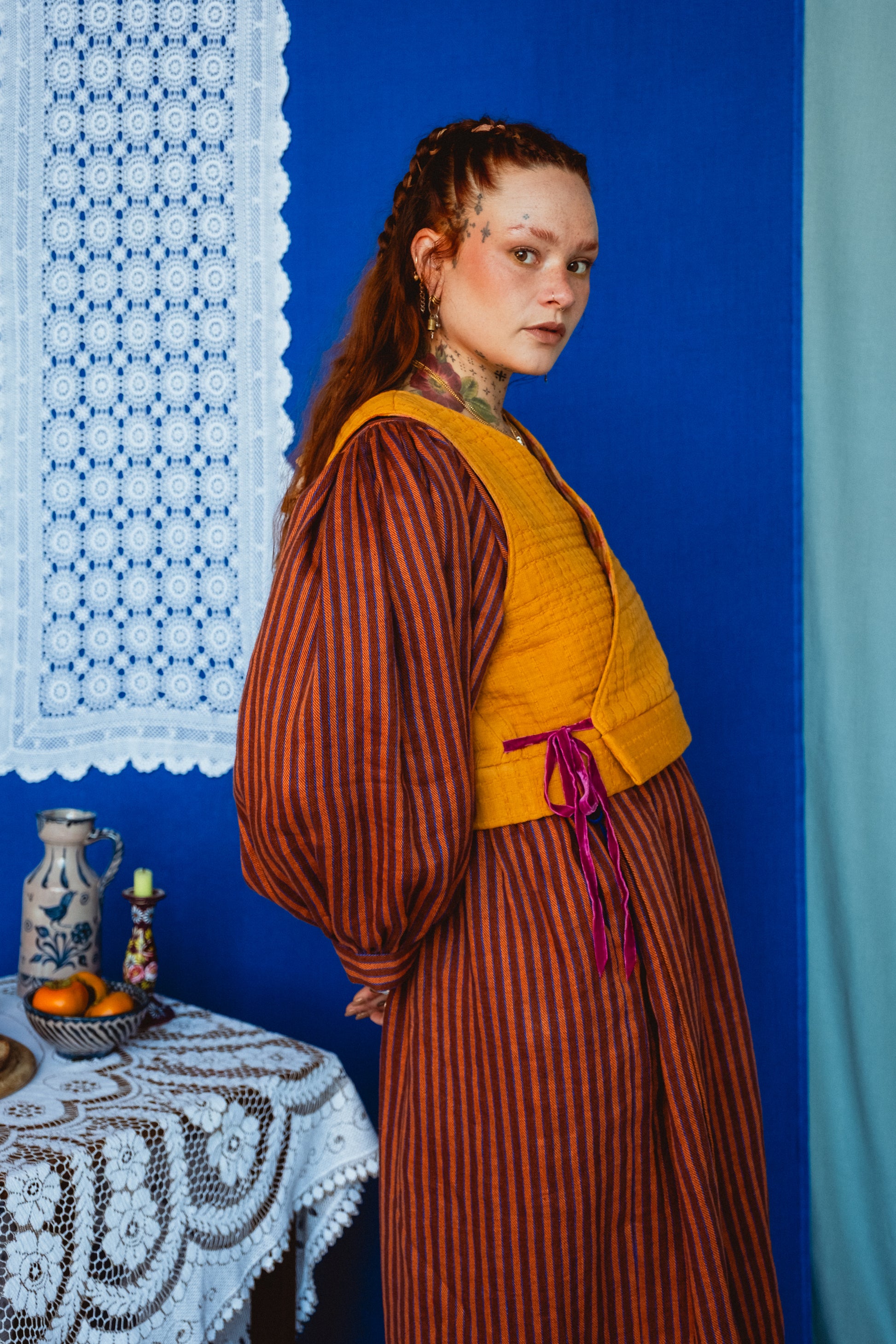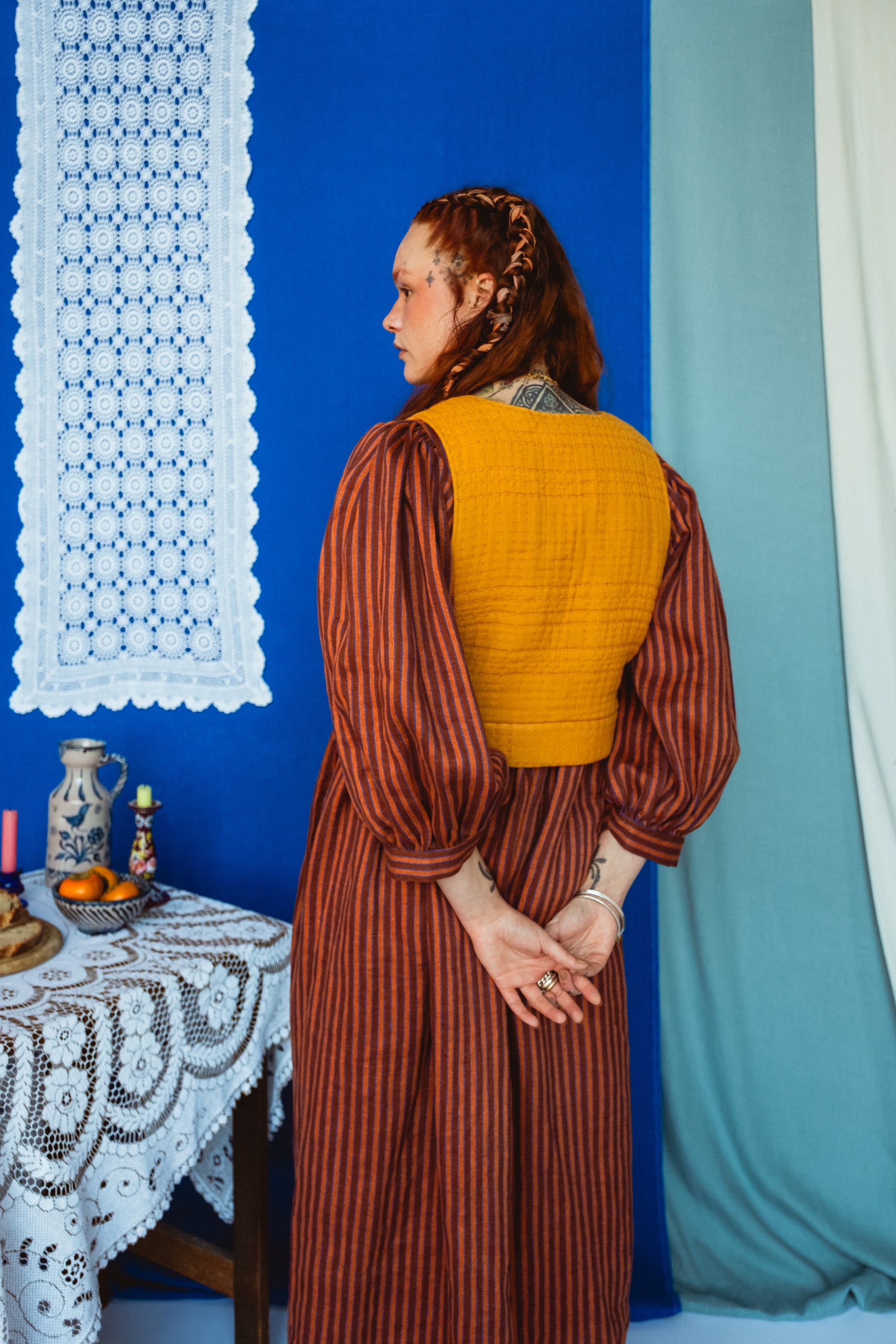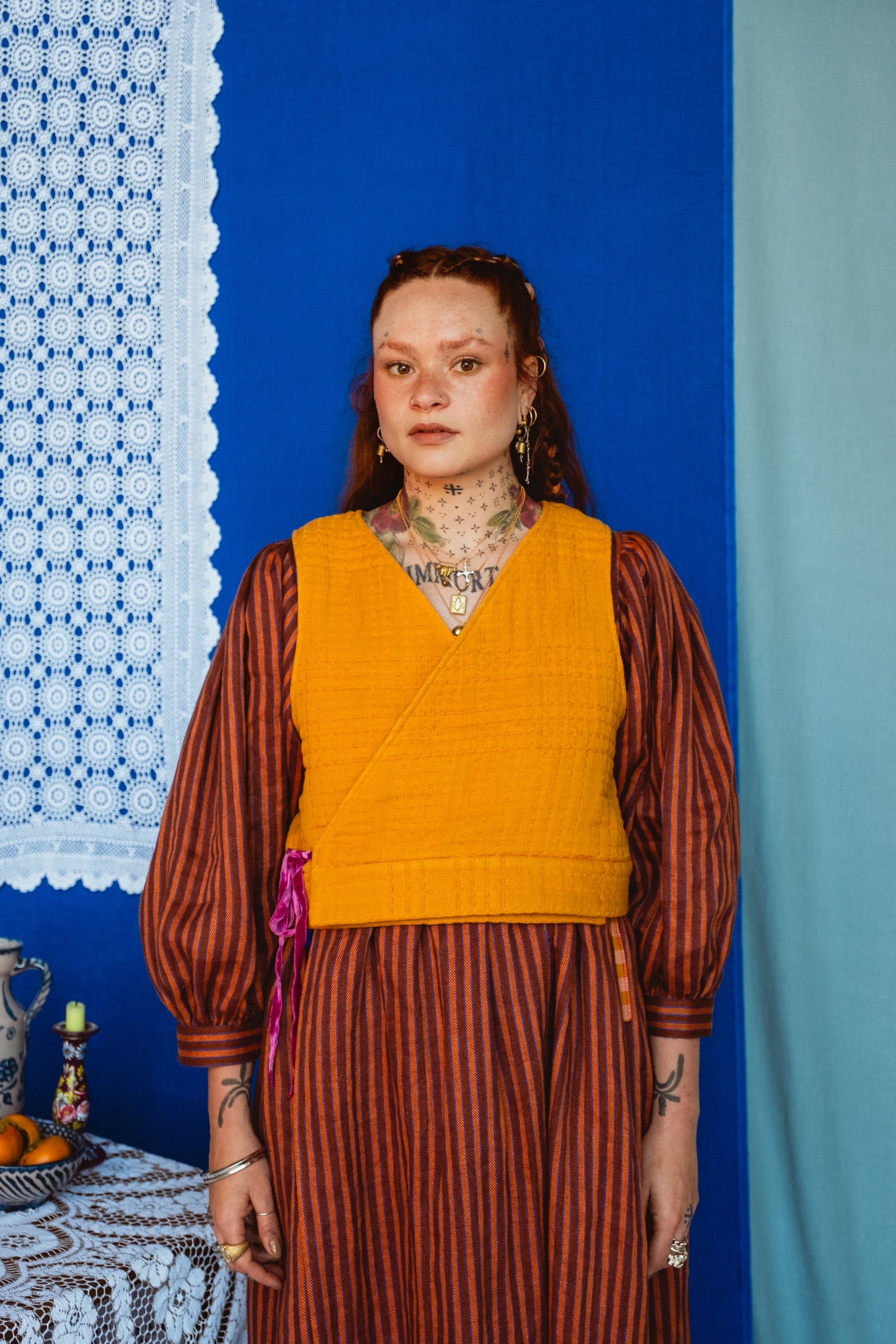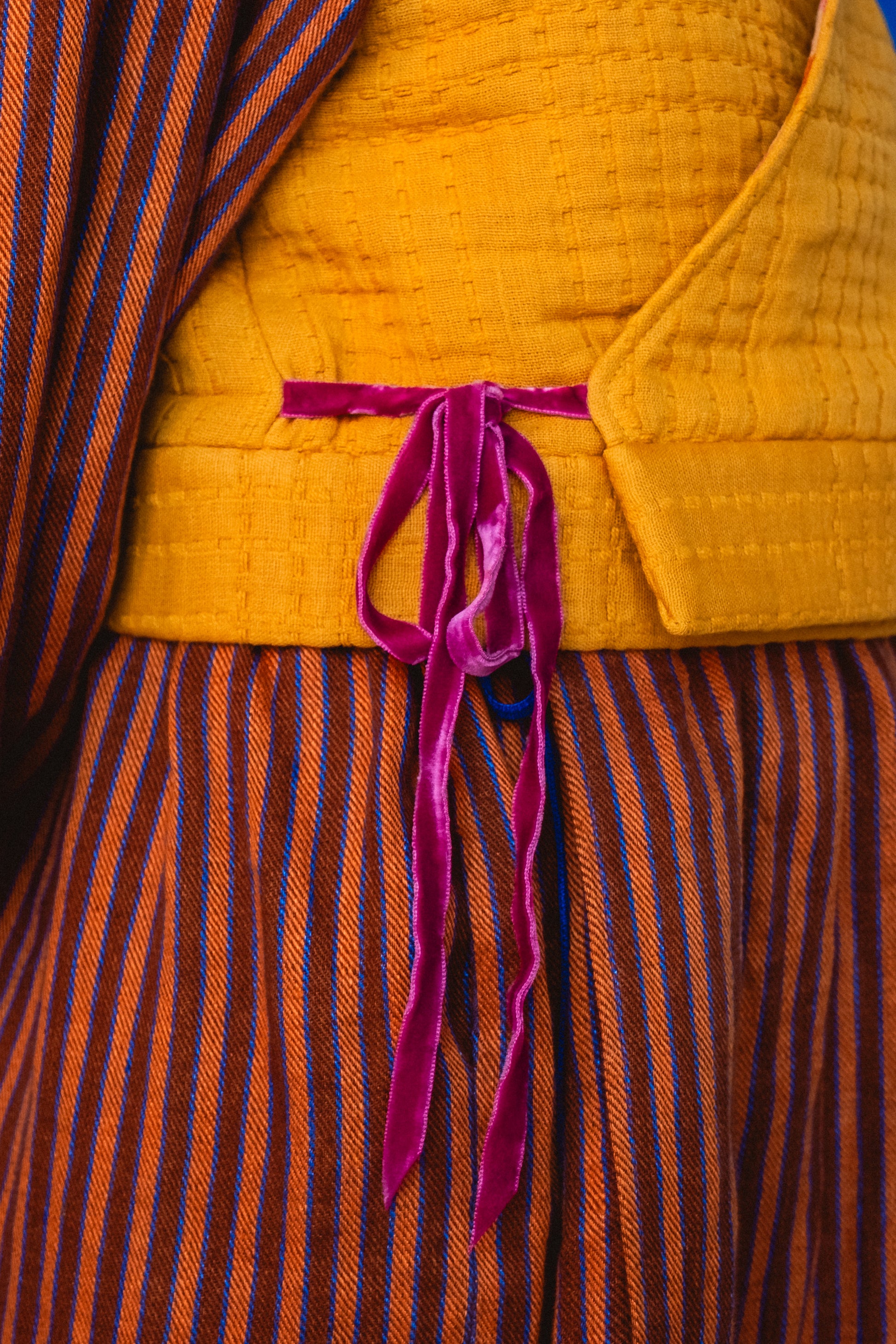 A bright honey mustard take on our classic Almond quilt. To join our squishy alumni, this vibrant quilt-like fabric is the perfect pop of colour to any outfit. Made from 100% Indian cotton this fabric is both cosy and breathable.  We have paired our Cloud 9 designs with a contrasting fuschia double-sided velvet ribbon, creating a unique colour story. The Cloud 9 Vest has been lined in our Grapefruit Gingham, a cotton/linen blend that perfectly compliments the quilted outer.