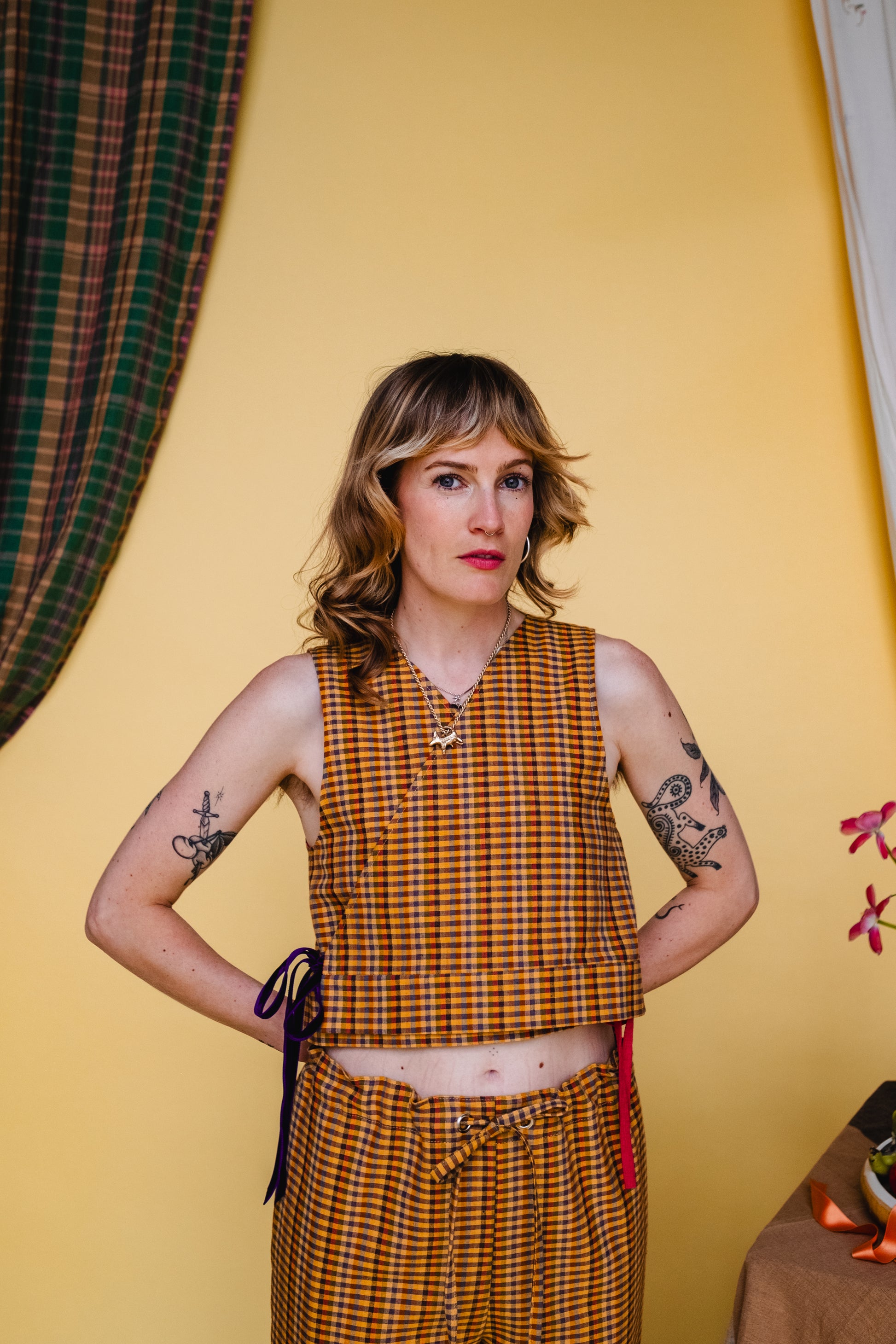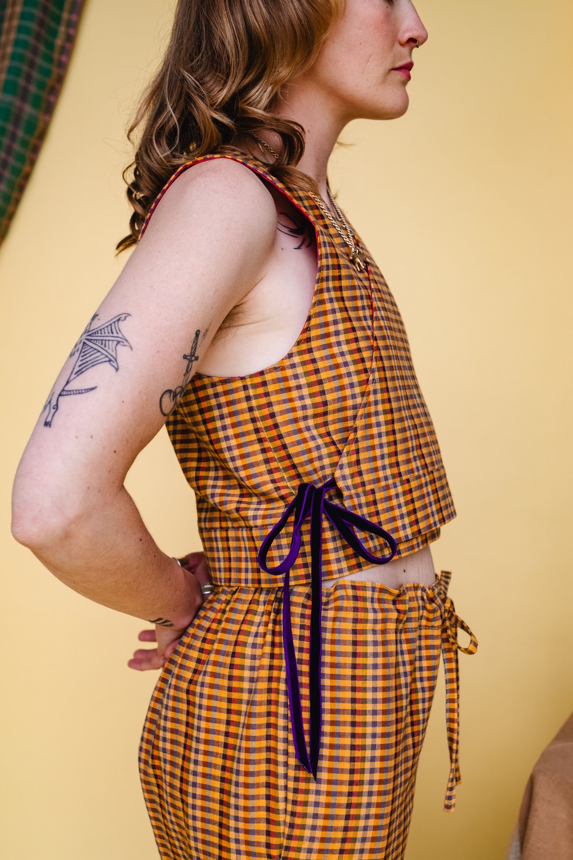 A midweight Indian cotton in an array of sunset tones, our Oslo check was aptly named after the vivid murals in Oslo town hall depicting pastoral life throughout the history of the city. With greens, blues, and reds all mixed among the orange tones, this multicoloured check will instantly be the breath of life you need in your everyday wardrobe. With a soft, almost brushed texture, this fabric will guarantee all day comfort whether you’re adventuring or slothing. Our Oslo Check has been paired with a deep violet double-sided velvet ribbon, to bring out the deeper tones in the design.