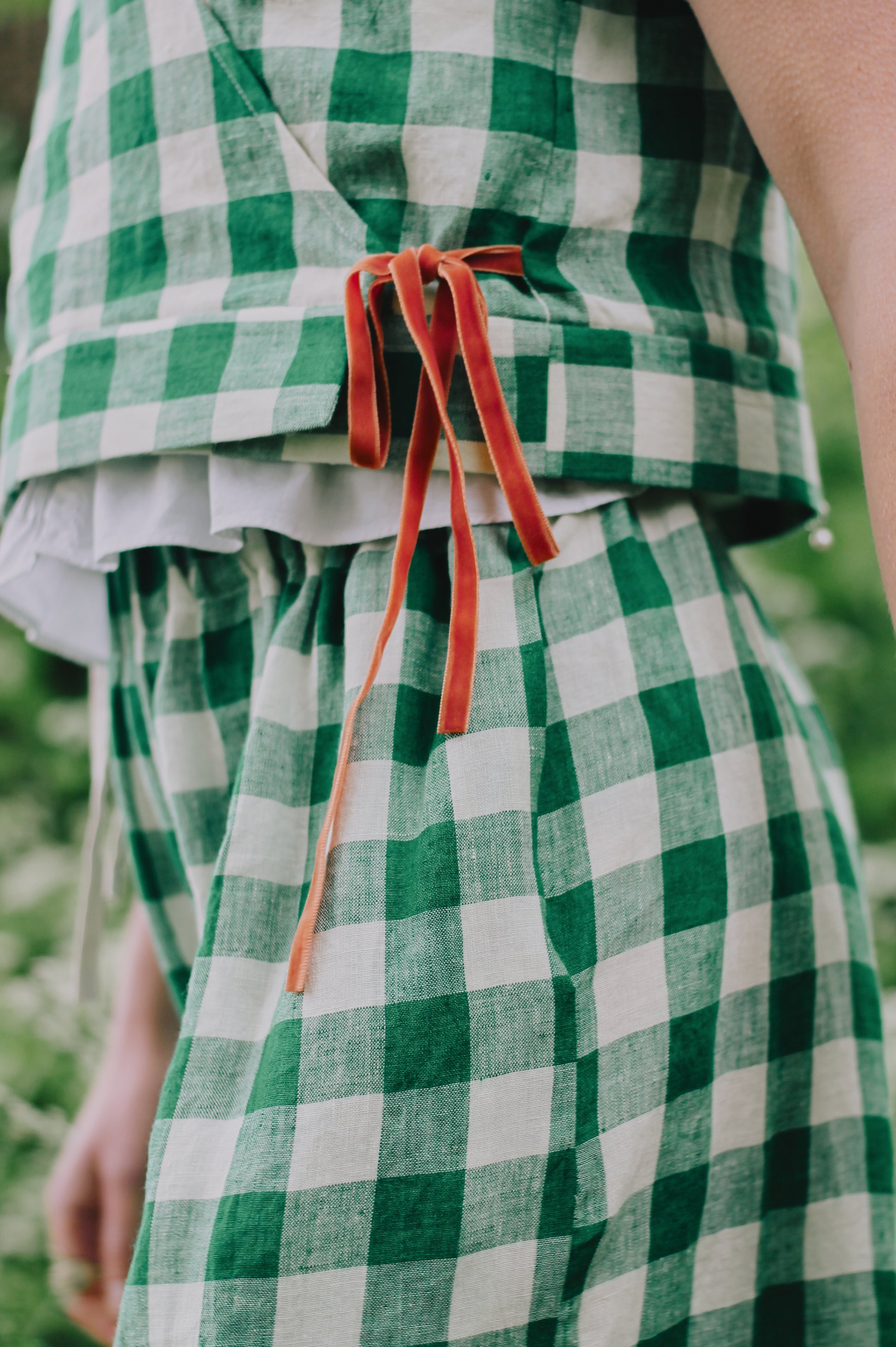 This beautiful Jewel Toned green and ecru gingham has been made form European Linen. Bouncy, light and breathable it makes the perfect companion to any summer picnic! Our Picnic Gingham is only available in our Cloud 9 Vests and Rebecca Trousers - Cloud 9 tops and dresses made on special request. Our Cloud 9 Vest has been paired with a contrasting Apricot double sided velvet ribbon.