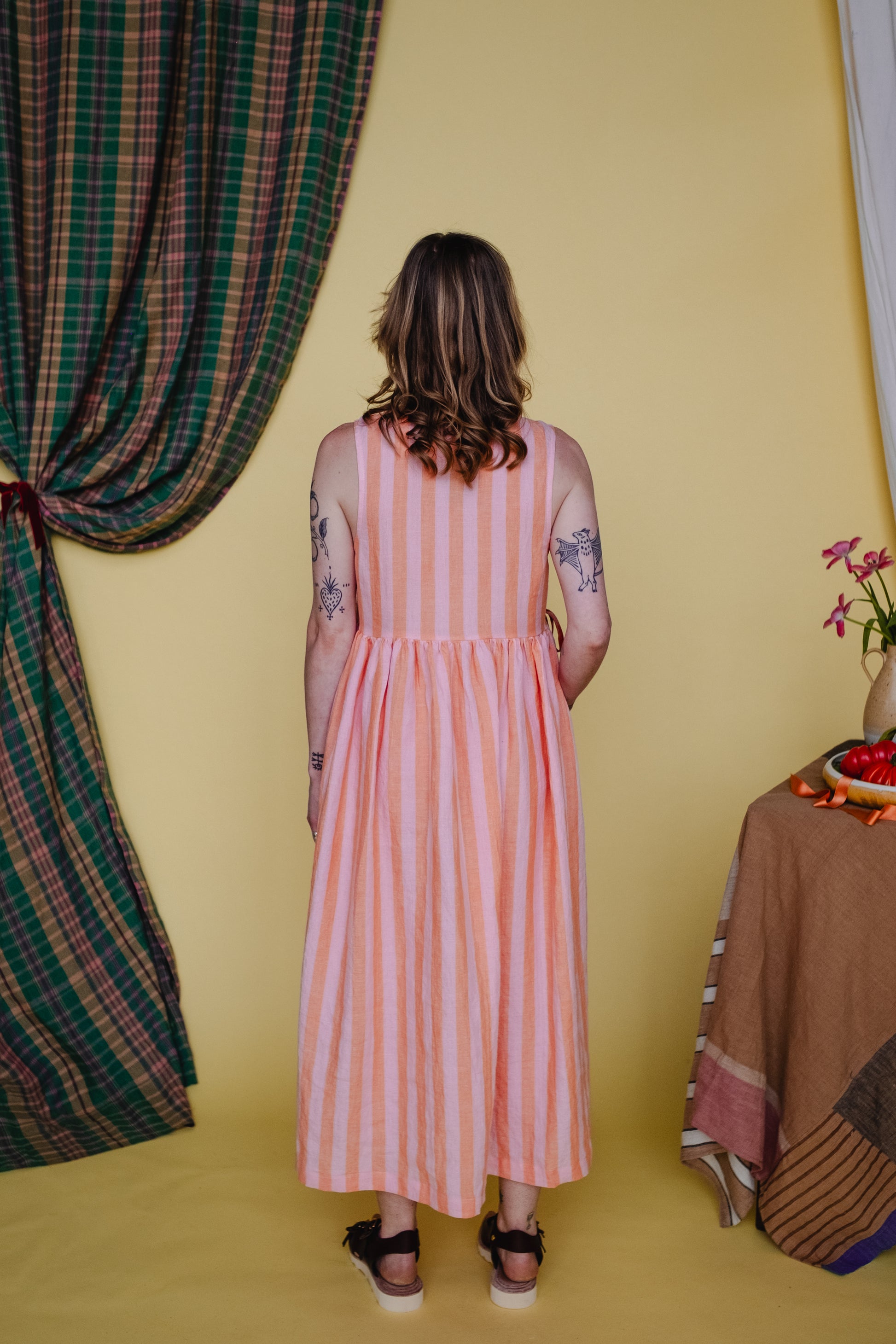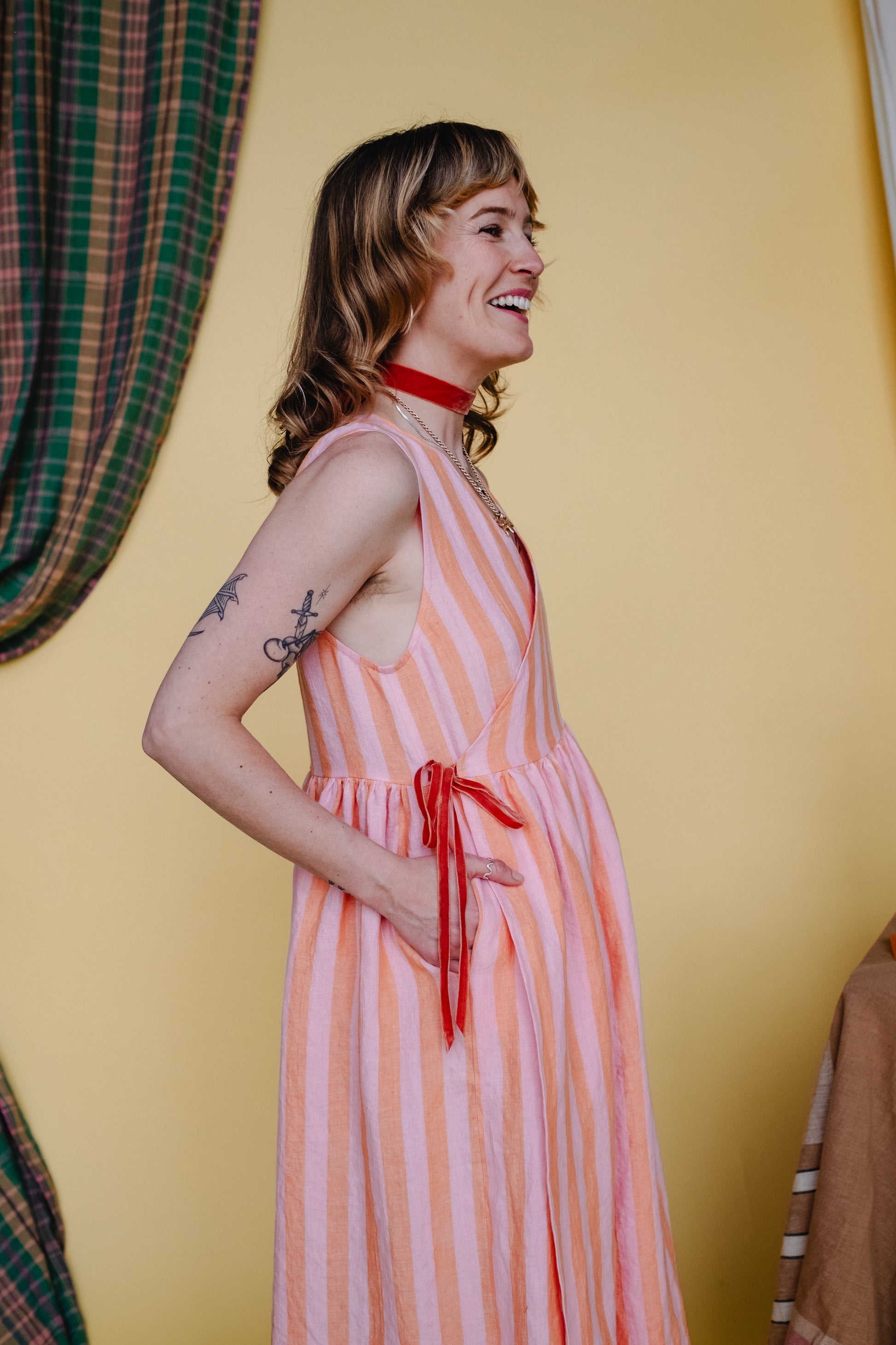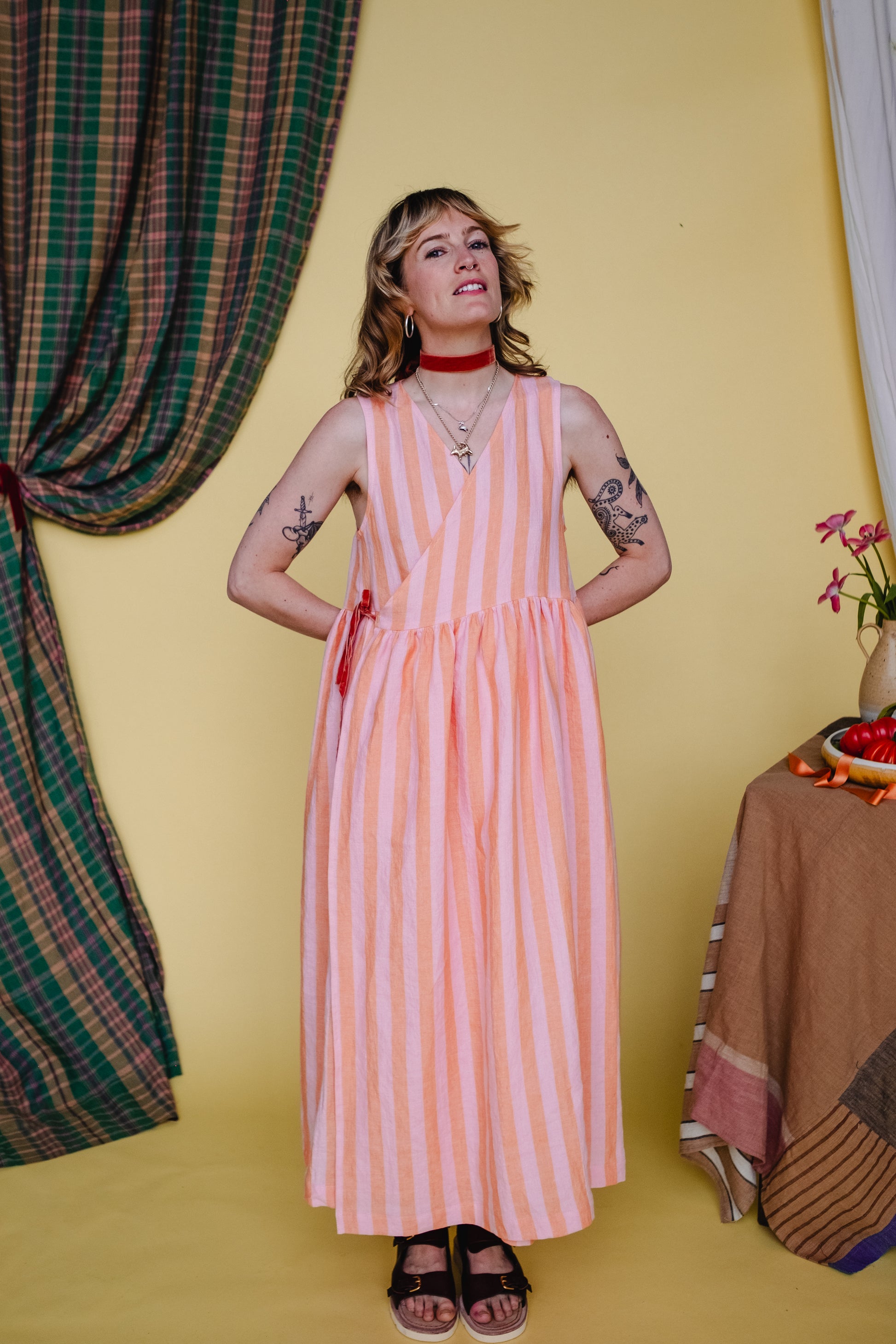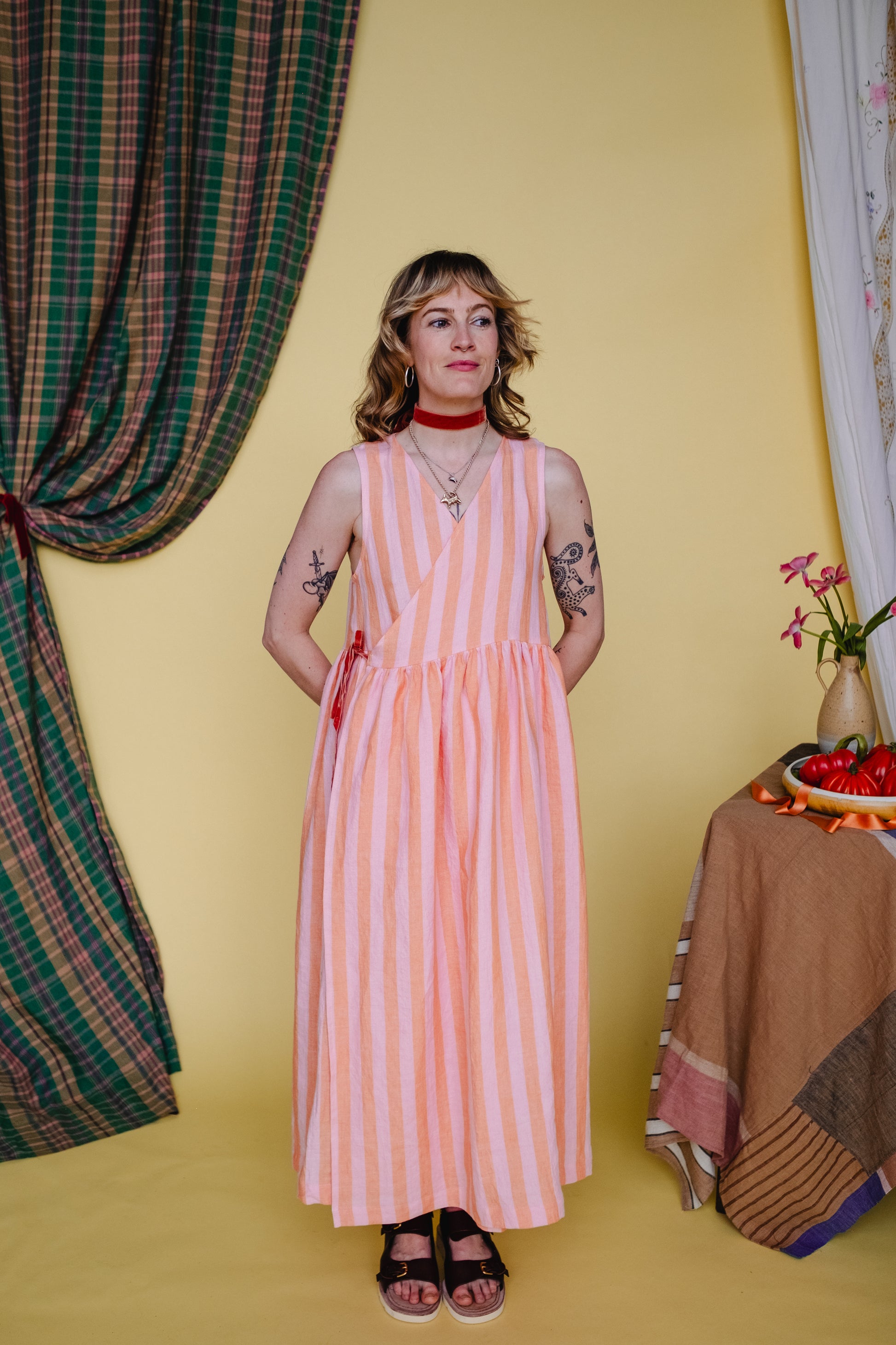 This dress is made from this vibrant juicy linen, you will be the visual treat at any picnic this summer. Our Fruit Salad is made from 100% mid/lightweight linen, spun and woven in small batches in Eastern Europe, making it incredibly breathable and soft to wear. Whether you’re out to run errands or at a glamorous event our Fruit Salad can see you through it all. Our Cloud 9 Top and Cloud 9 Dress has been paired with a complimentary apricot double sided velvet ribbon to tie.