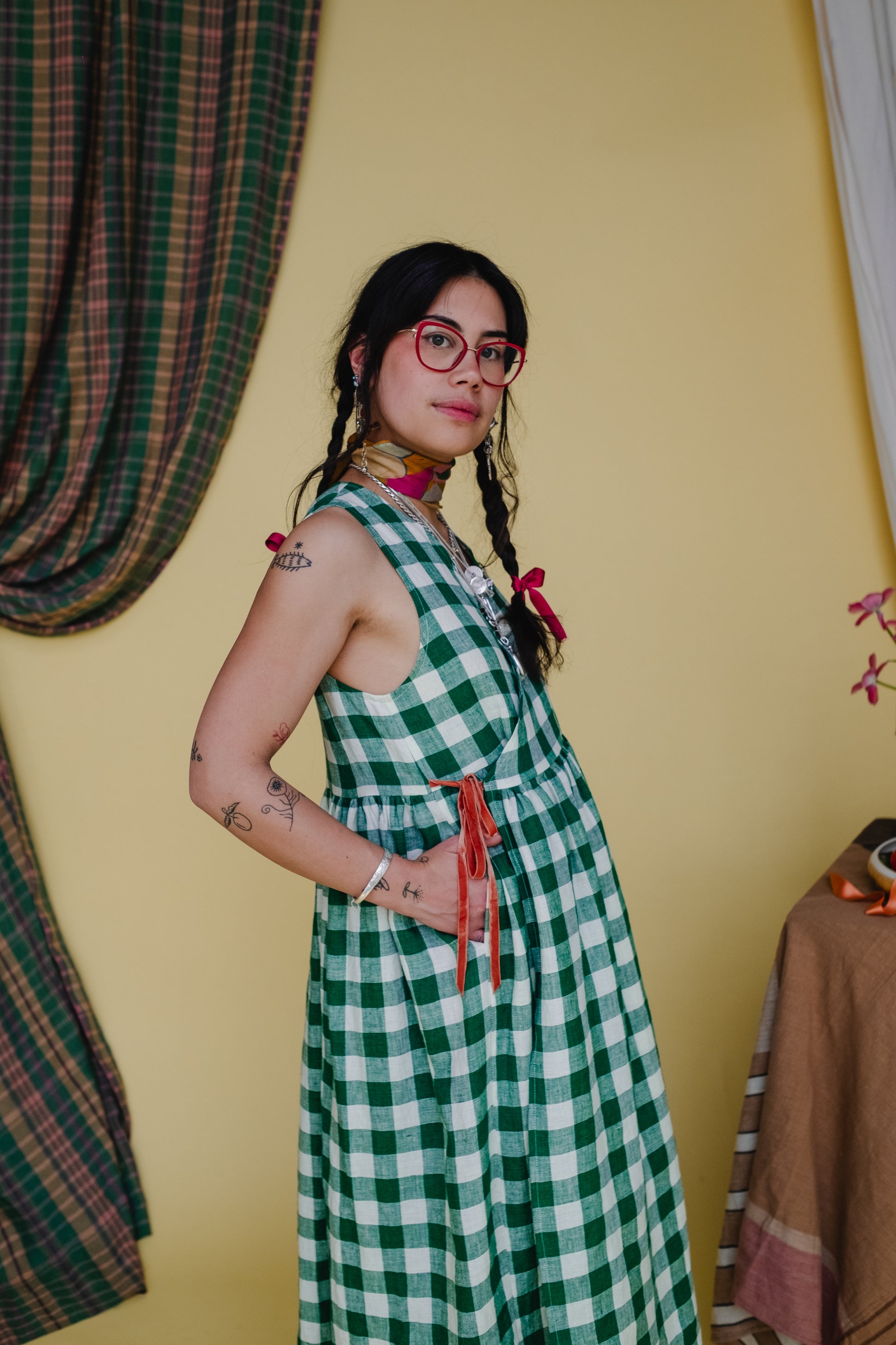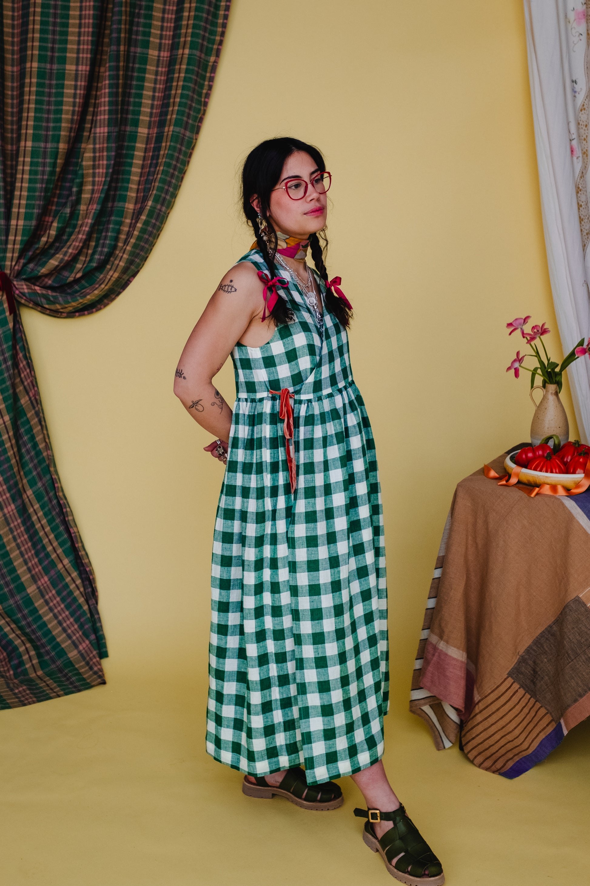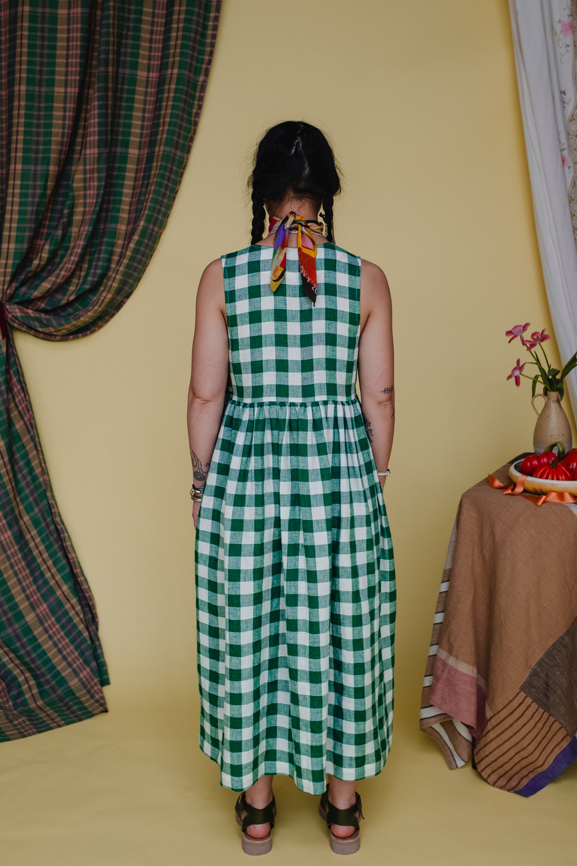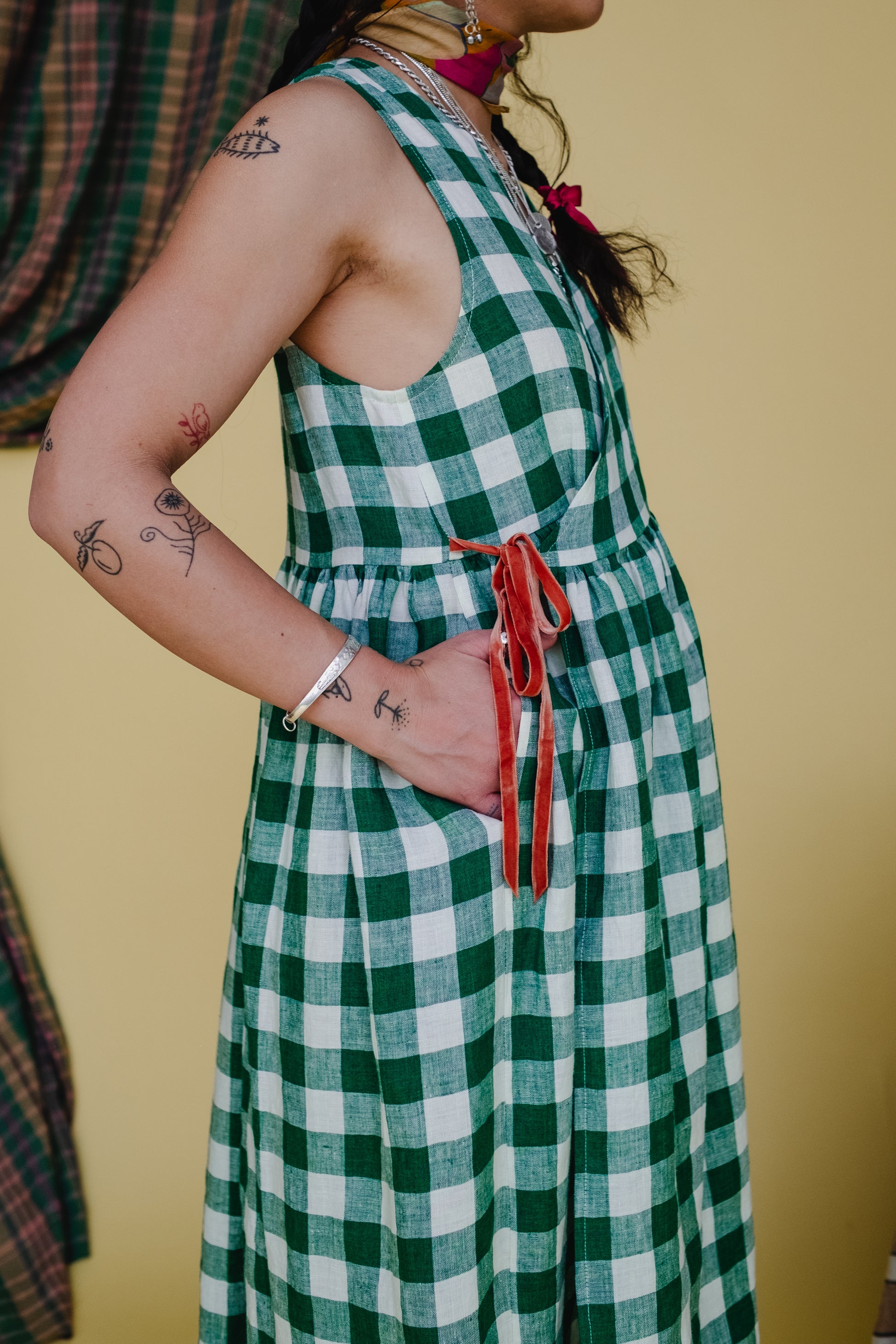 This dress is made from a beautiful jewel toned green and ecru gingham, made from 100% European Linen. Bouncy, light and breathable it makes the perfect companion to any summer picnic! Our Picnic Gingham is only available in our Cloud 9 Vests and Rebecca Trousers - Cloud 9 tops and dresses made on special request. Our Cloud 9 Vest has been paired with a contrasting Apricot double sided velvet ribbon.