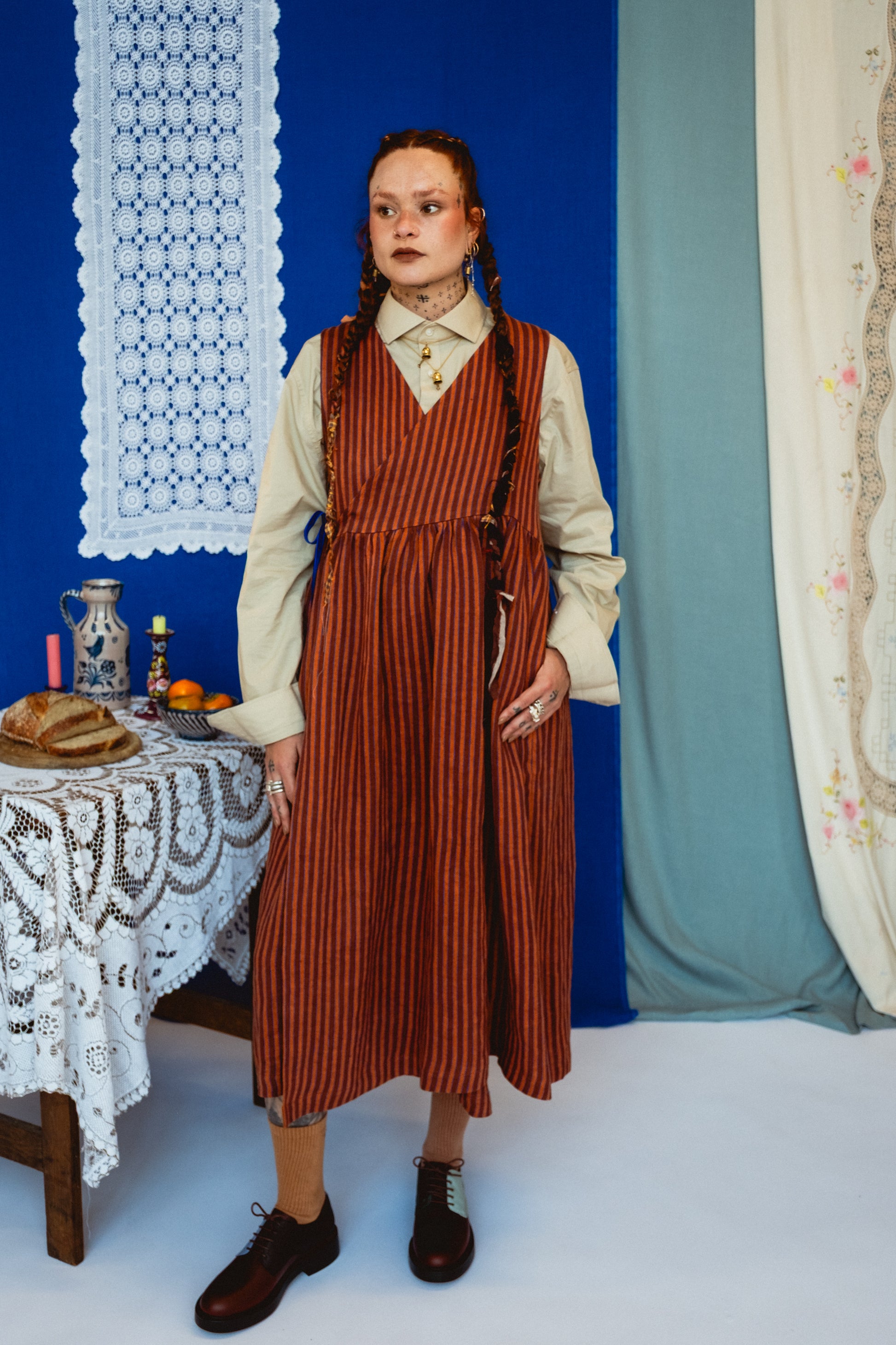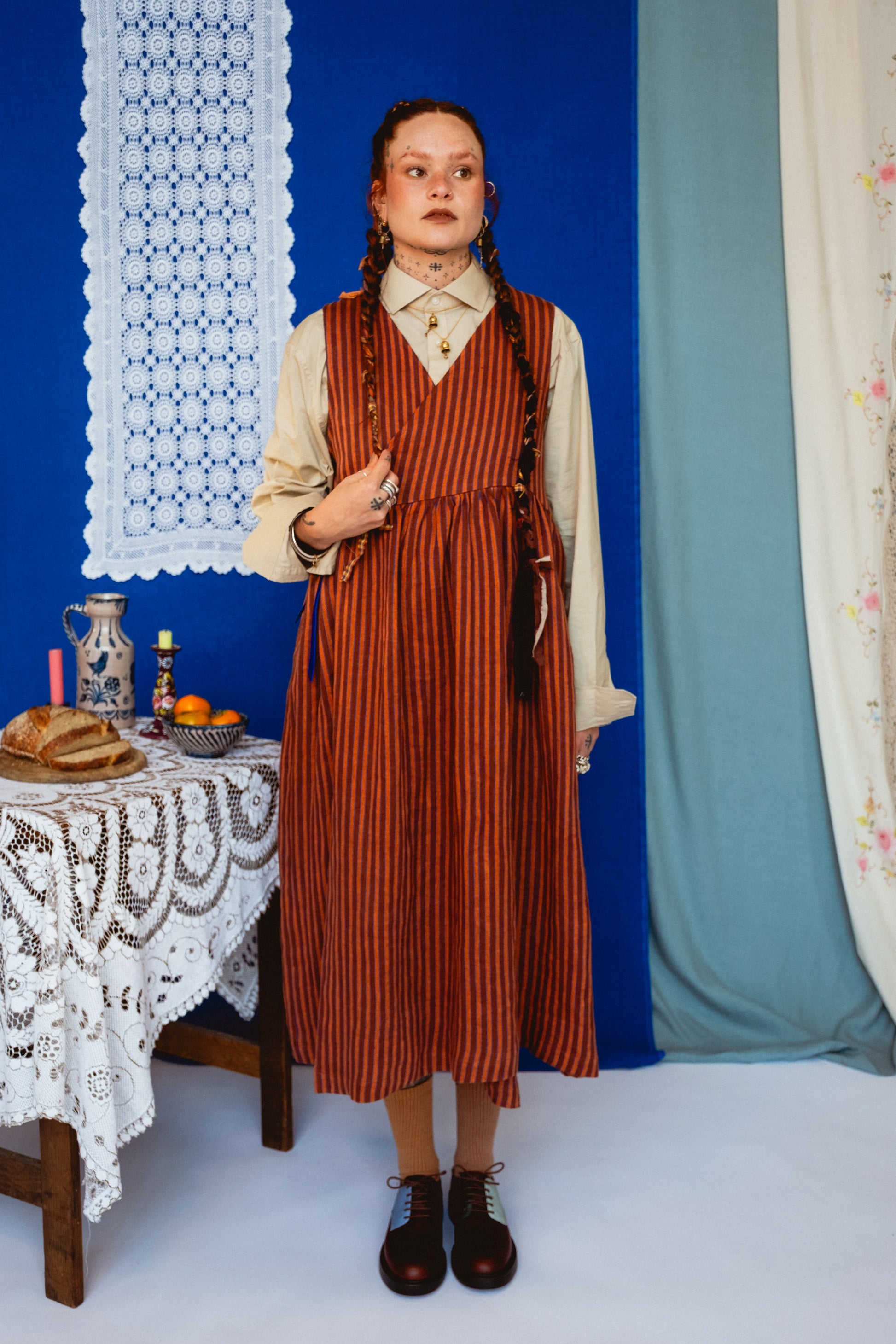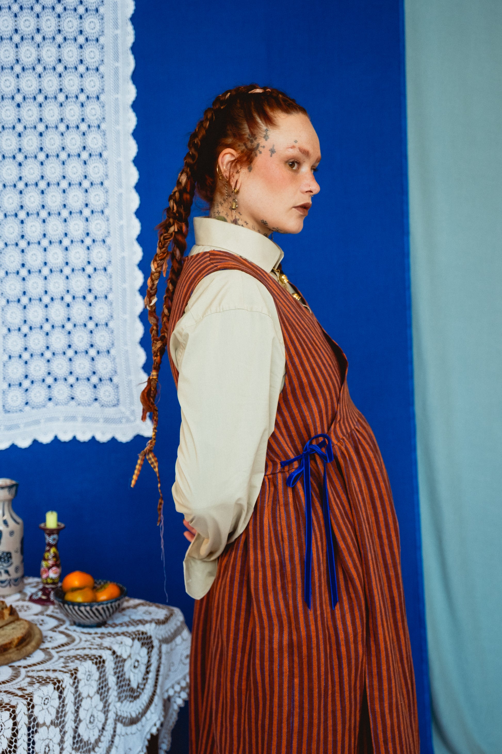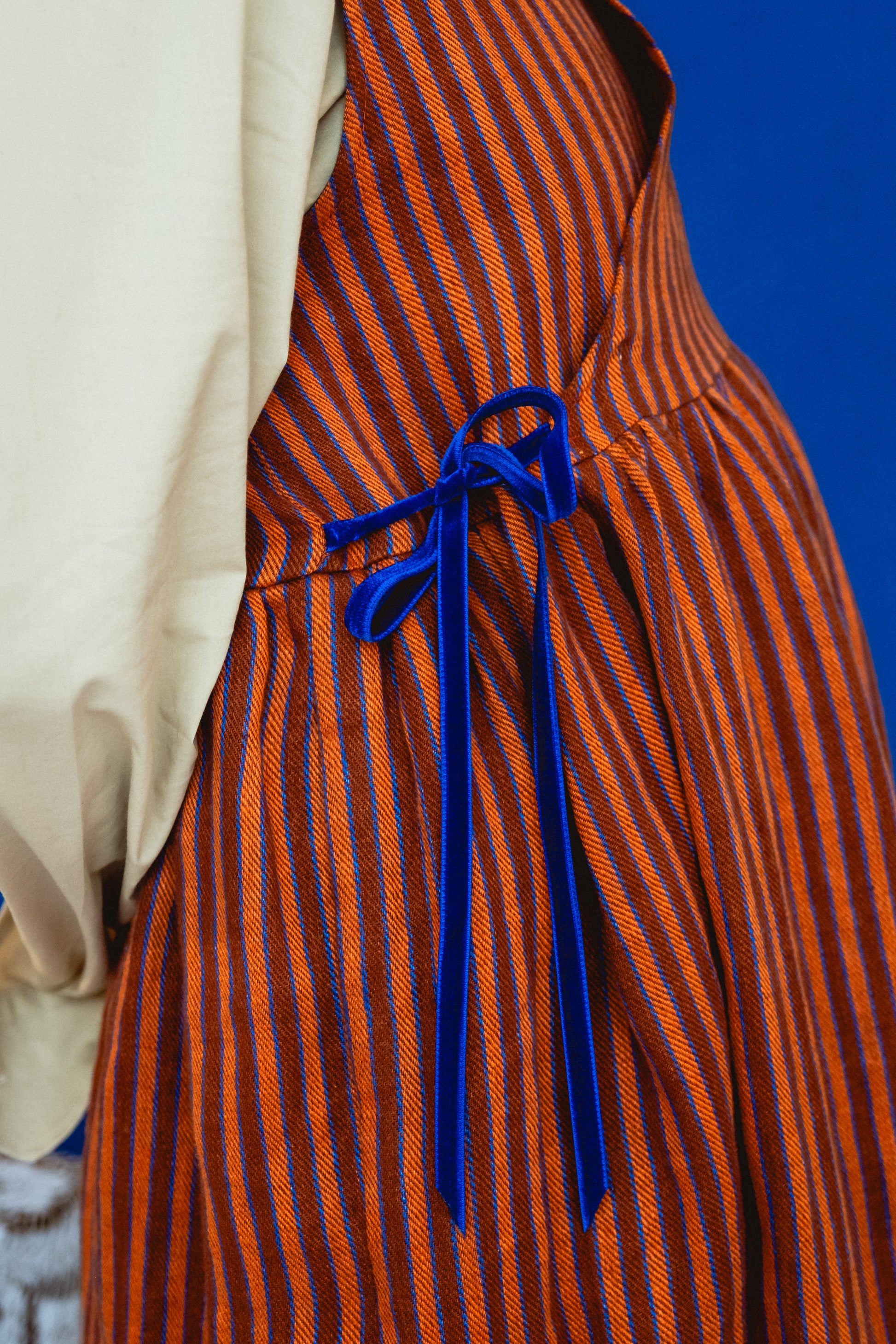 A heavier weight to our other linen ranges, this striped twill is the perfect fabric to transition the seasons with you. Naturally breathable and bouncy, this fabric is made from 100% Eastern European linen in small batches. In a bold cinnamon and pumpkin stripe and outlined with a vibrant cobalt, this unique colourway will be a striking addition to any outfit.  To bring out the beautiful blue stripe we have paired our Toasted Cinnamon Stripe with a cobalt double sided velvet ribbon.