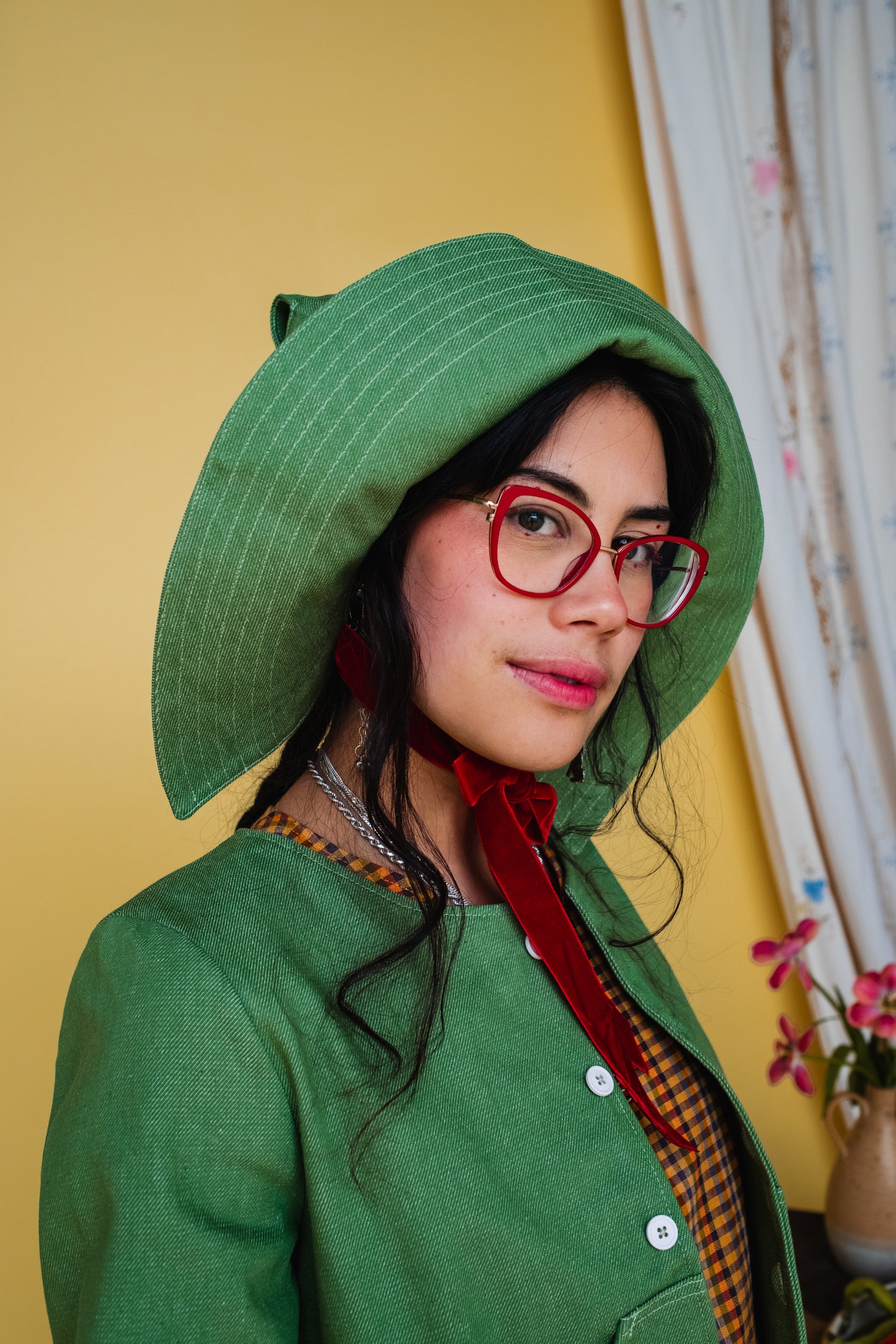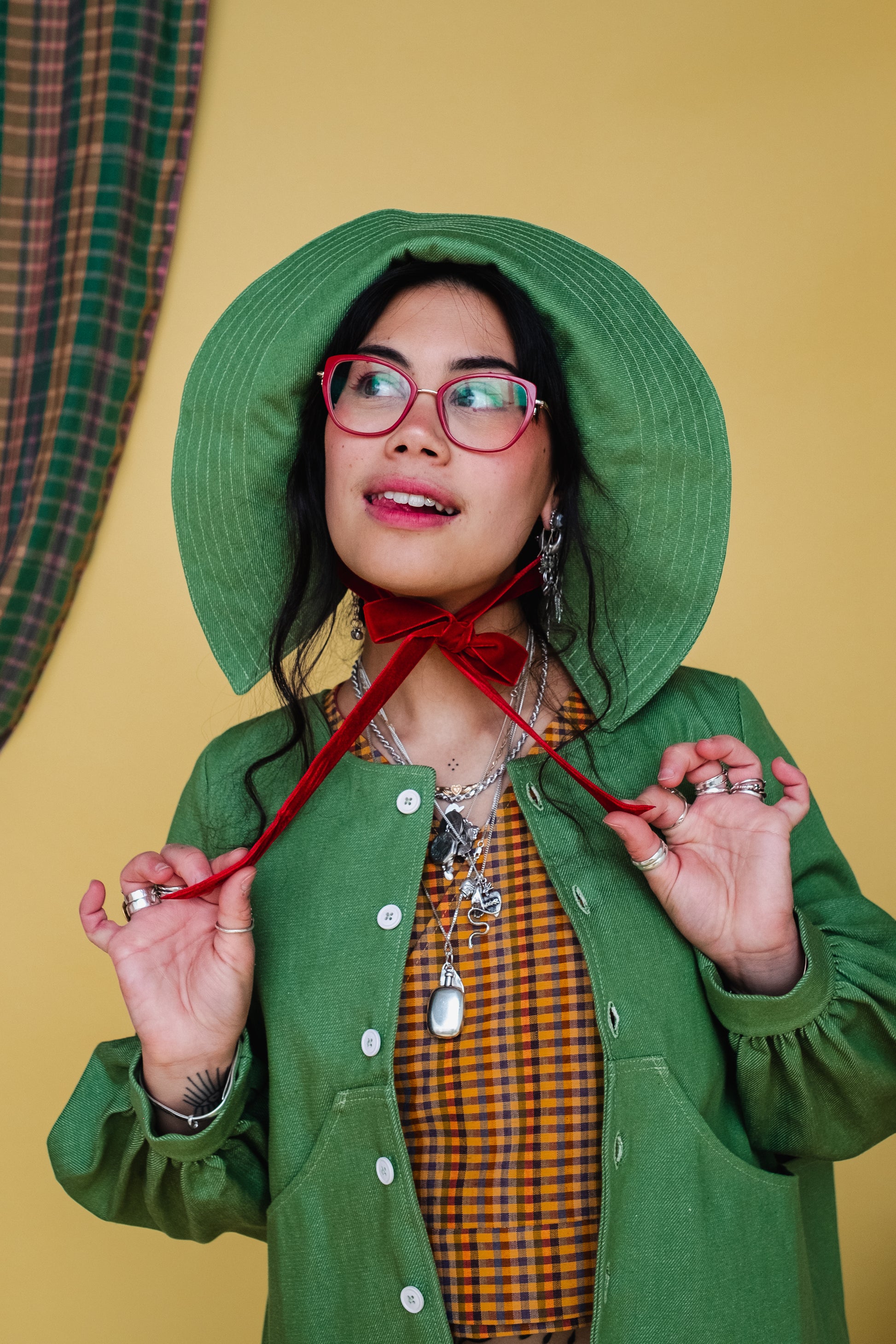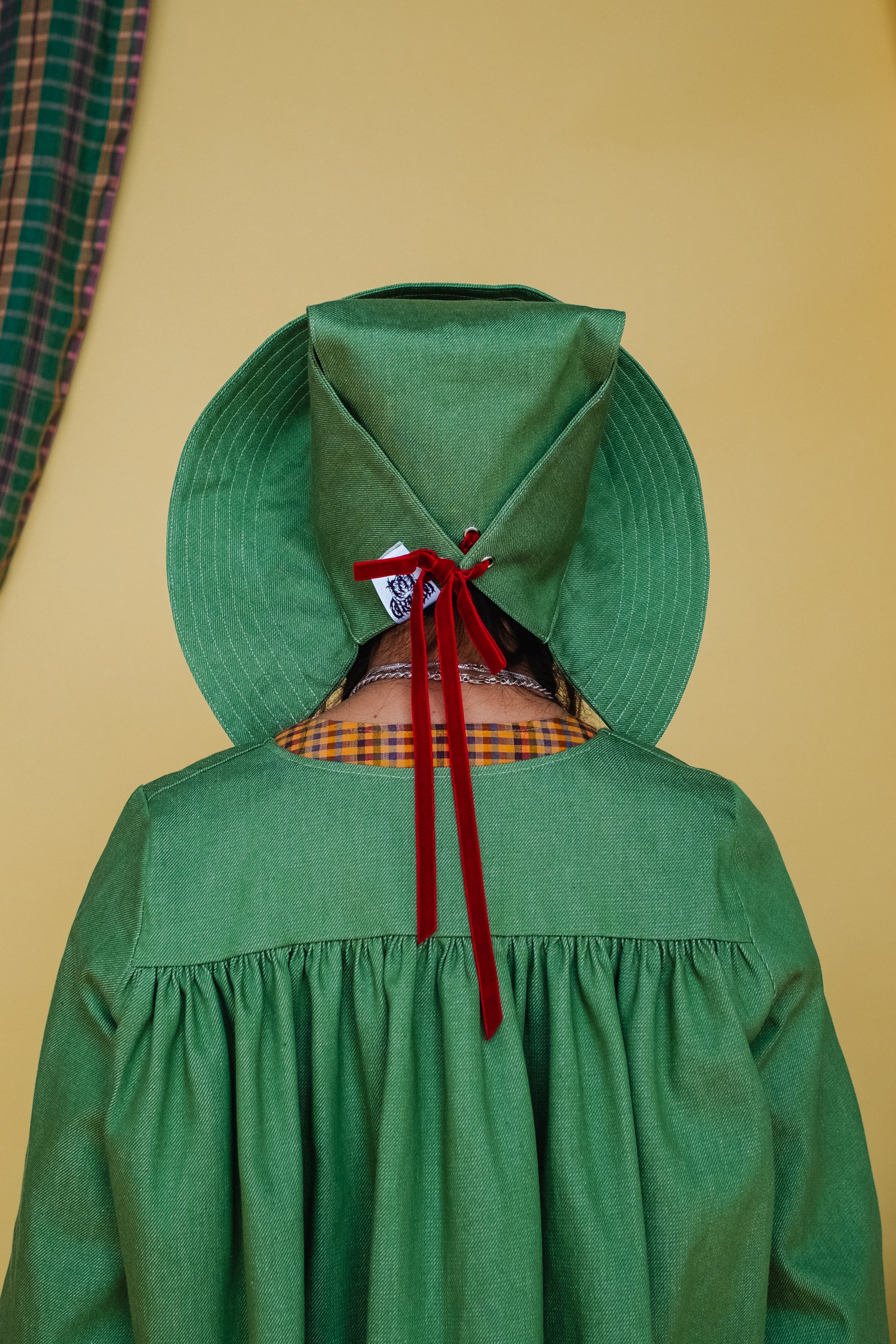 The ultimate summer bonnet! We teamed with friend of the brand Cat O’Brien to create a limited run of Cat’s bonnets using our new SS’25 ‘Into The Garden’ fabrics. Known for her historically inspired garments these bonnet hats were originally inspired by a 1940's magazine pattern for a gardening hat, and have been reimagined by Cat with modern twists, and, of course, her signature eyelets as the back fastening. Each hat is ready-to-ship with a very limited run in each SS’25 colourway, paired with a Tapuh classic double-sided velvet ribbon to tie under the chin and at the back of the hat.