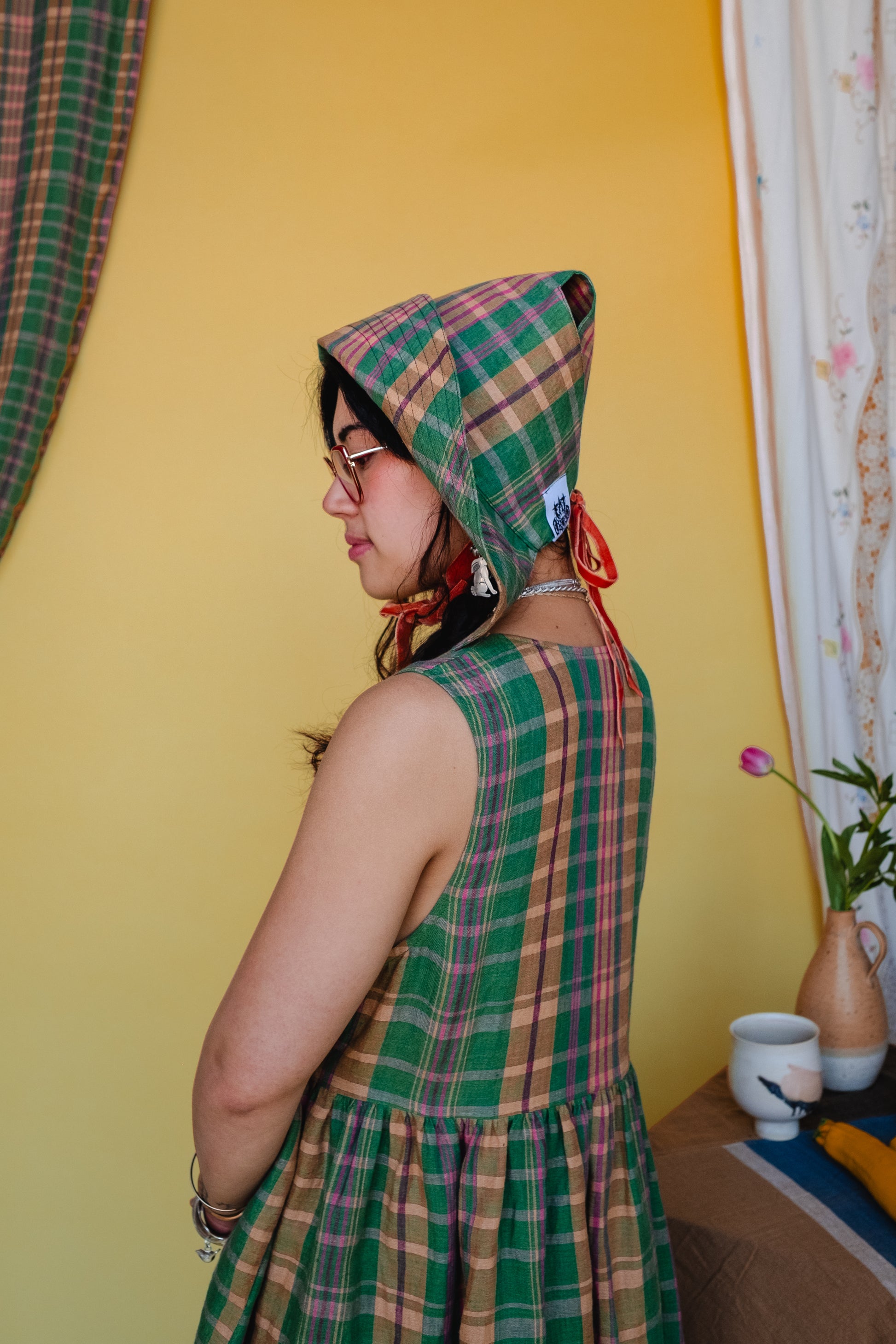 As the word Tavola suggests (Italian for dining table) this linen evokes the feeling of a classic table cloth that hosts only the most exuberant and delicious summer meals. Made using 100% Eastern European linen and AZO-free dyes, this bold fabric weaves together verdant green, fuschia, wine red and pale orange - creating a joyful fabric made for twirling, eating and dancing in. We have paired our Tavola check with an Apricot double-sided velvet ribbon, leaning into the fresh and juicy colour scheme of the fabric.