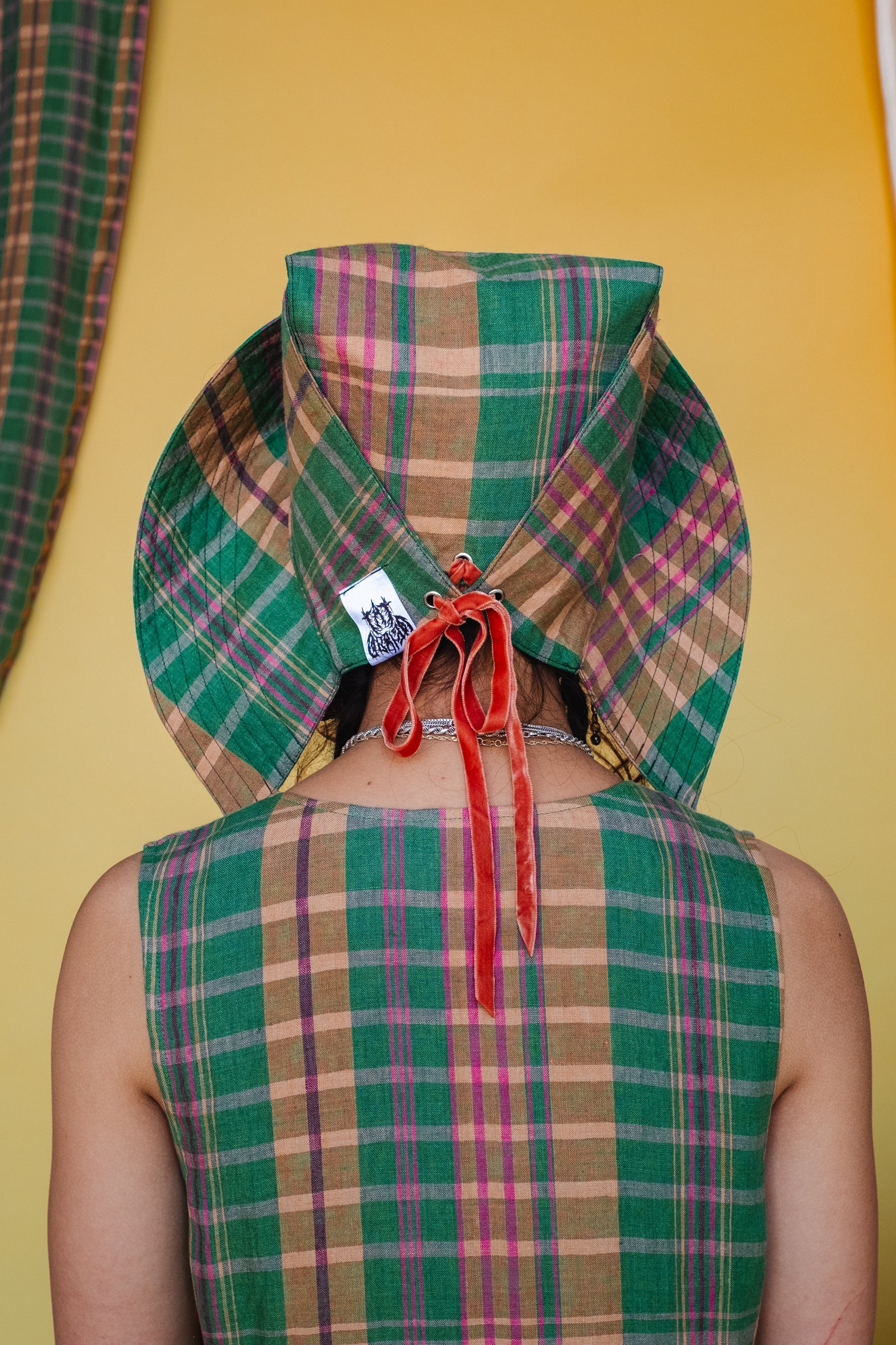 The ultimate summer bonnet! We teamed with friend of the brand Cat O’Brien to create a limited run of Cat’s bonnets using our new SS’25 ‘Into The Garden’ fabrics. Known for her historically inspired garments these bonnet hats were originally inspired by a 1940's magazine pattern for a gardening hat, and have been reimagined by Cat with modern twists, and, of course, her signature eyelets as the back fastening. Each hat is ready-to-ship with a very limited run in each SS’25 colourway, paired with a Tapuh classic double-sided velvet ribbon to tie under the chin and at the back of the hat.